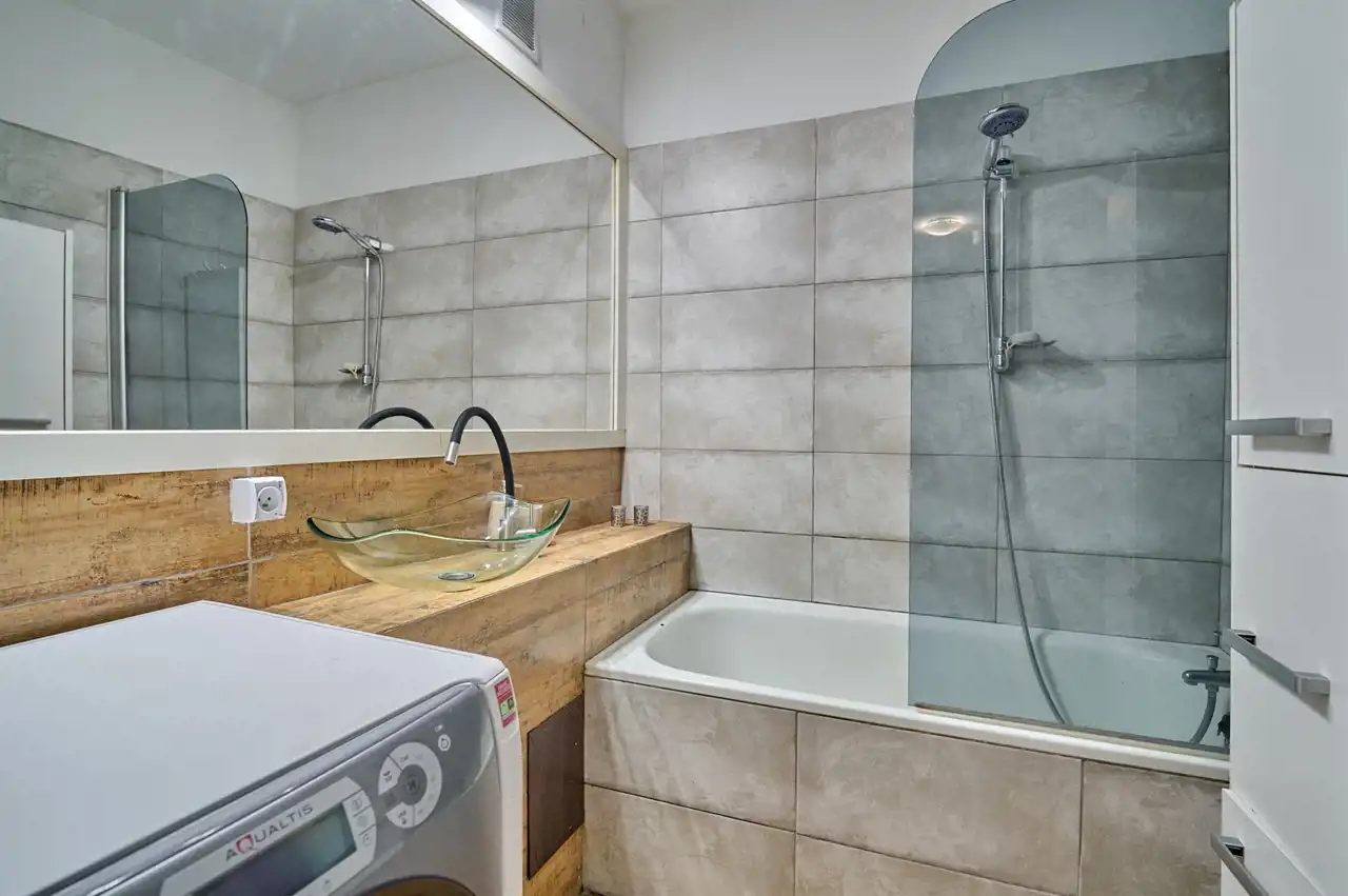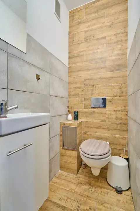 Łazienka i WC osobno, w gustownych płytkach.