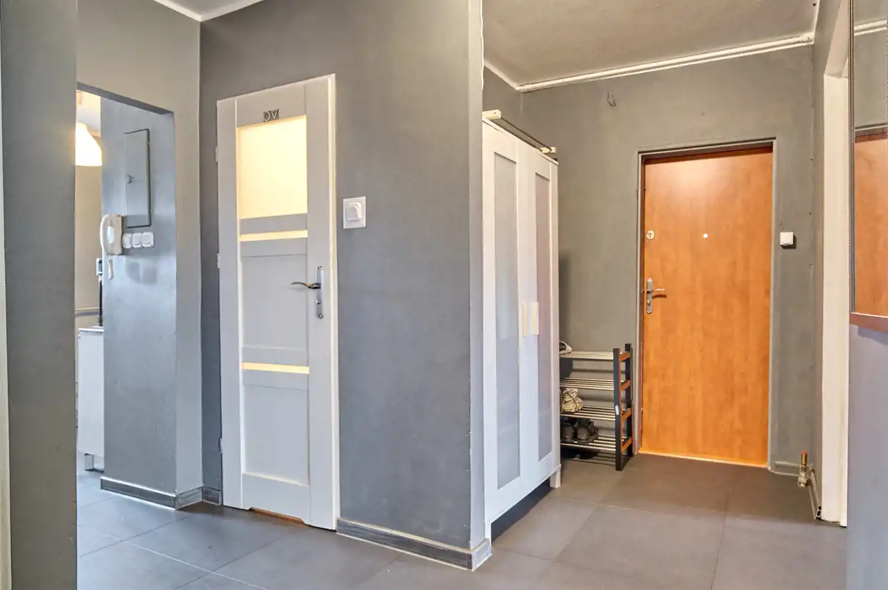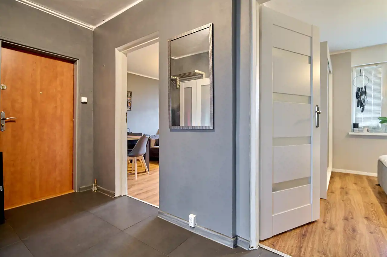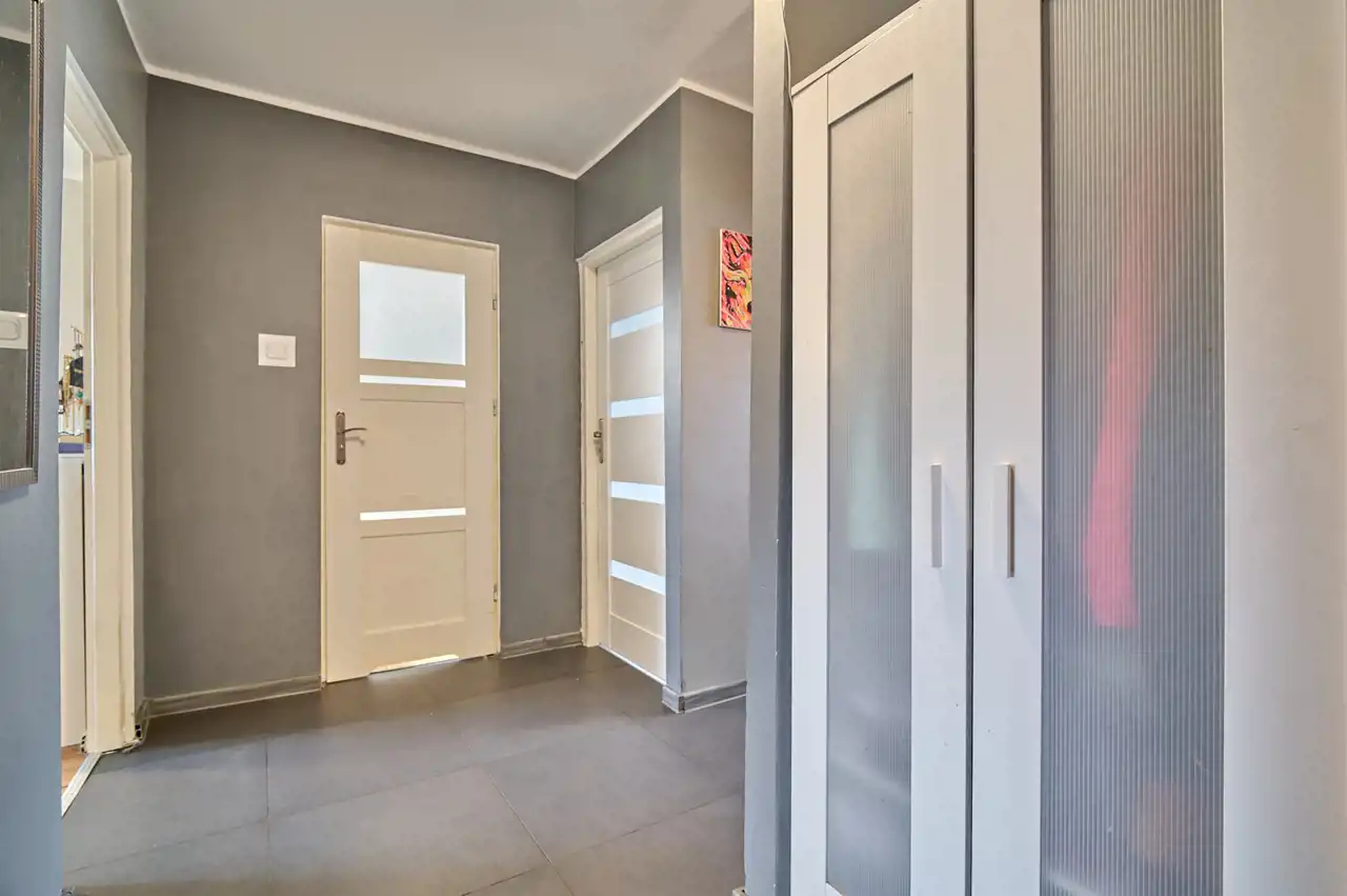 Przedpokój w nowoczesnych płytkach, ściany gipsowane.