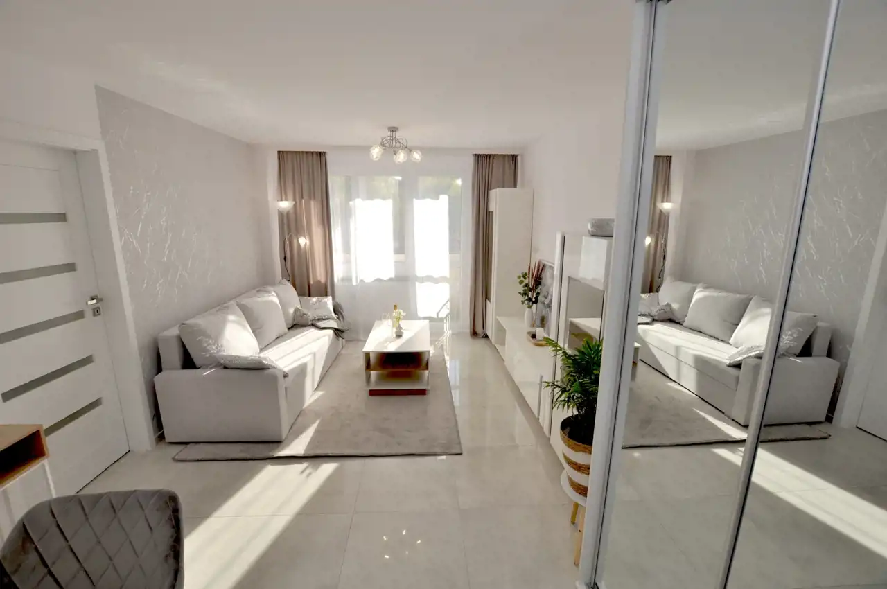 wygodne łóżko, rozkładana sofa, stół jadalny, krzesła tapicerowane, pojemne szafy, dekoracje, dywany, zasłony zaciemniające, lamele ozdobne, stylowe dodatki i tekstylia (koce, poduszki). Wszystko nowe, nieużywane, na gwarancji, starannie dobrane, tworzy spójną i przytulną przestrzeń.