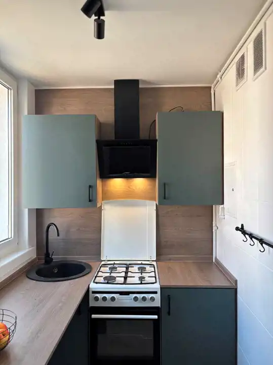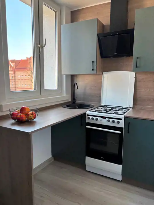 Kuchnia : o powierzchni 5,80 m2 - meble z nowoczesną zabudową kuchenną , kuchenka gazowa z piekarnikiem elektrycznym, okap kuchenny, jednokomorowy zlew. W kuchni halogeny ,w meblach kuchennych podświetlenie LED. Ściany -fartuch kuchenny -nowoczesna glazura. Okna PCV.