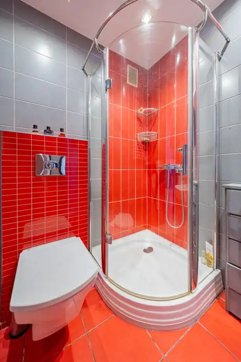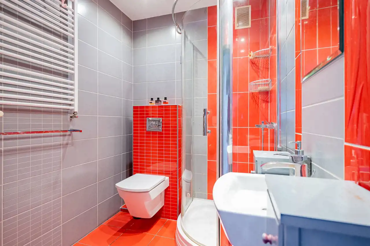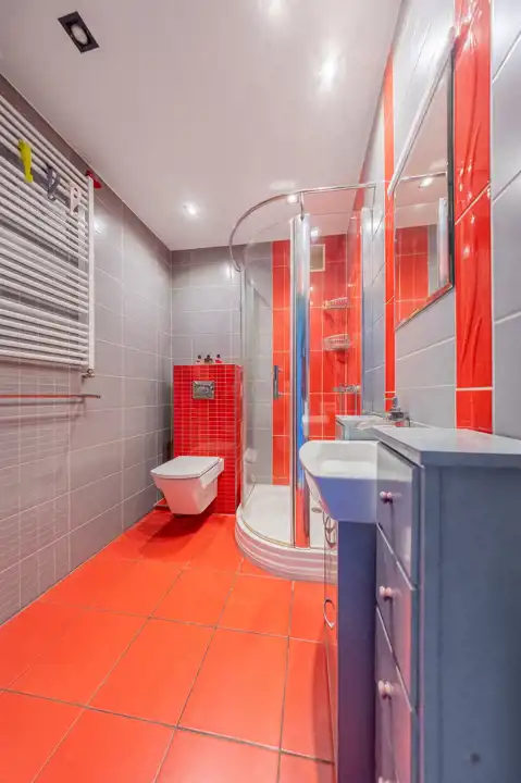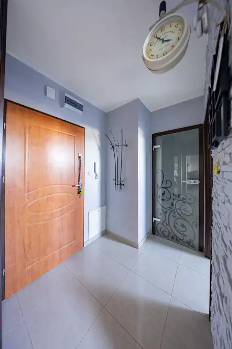 Wnętrza zostały urządzone z dbałością o komfort, przestrzeń i światło. Zarówno w łazience, jak i w pokoju zamontowano ozdobne, szklane drzwi, które nadają pomieszczeniom nowoczesny wygląd i pięknie przepuszczają światło. W korytarzu ściany zdobią dekoracyjne płytki, które są nie tylko stylowe, ale i niezwykle trwałe.