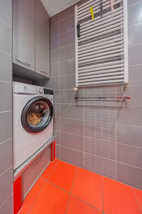 - Łazienka z WC: Wyposażona w kabinę prysznicową, z miejscem na pralkę i dodatkową zabudowę meblową.