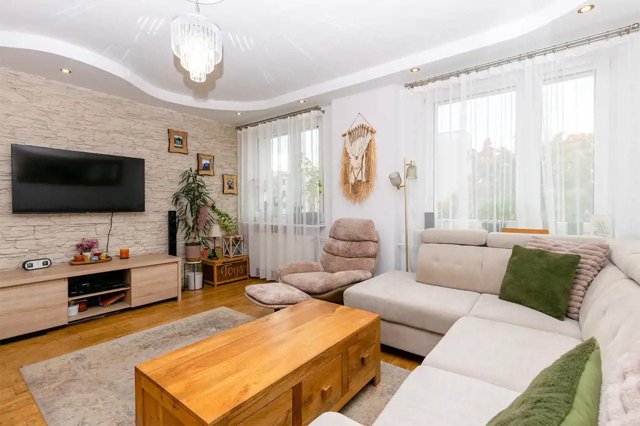 Salon: 19 m² – duży, połączony z dwóch mniejszych pokoi,