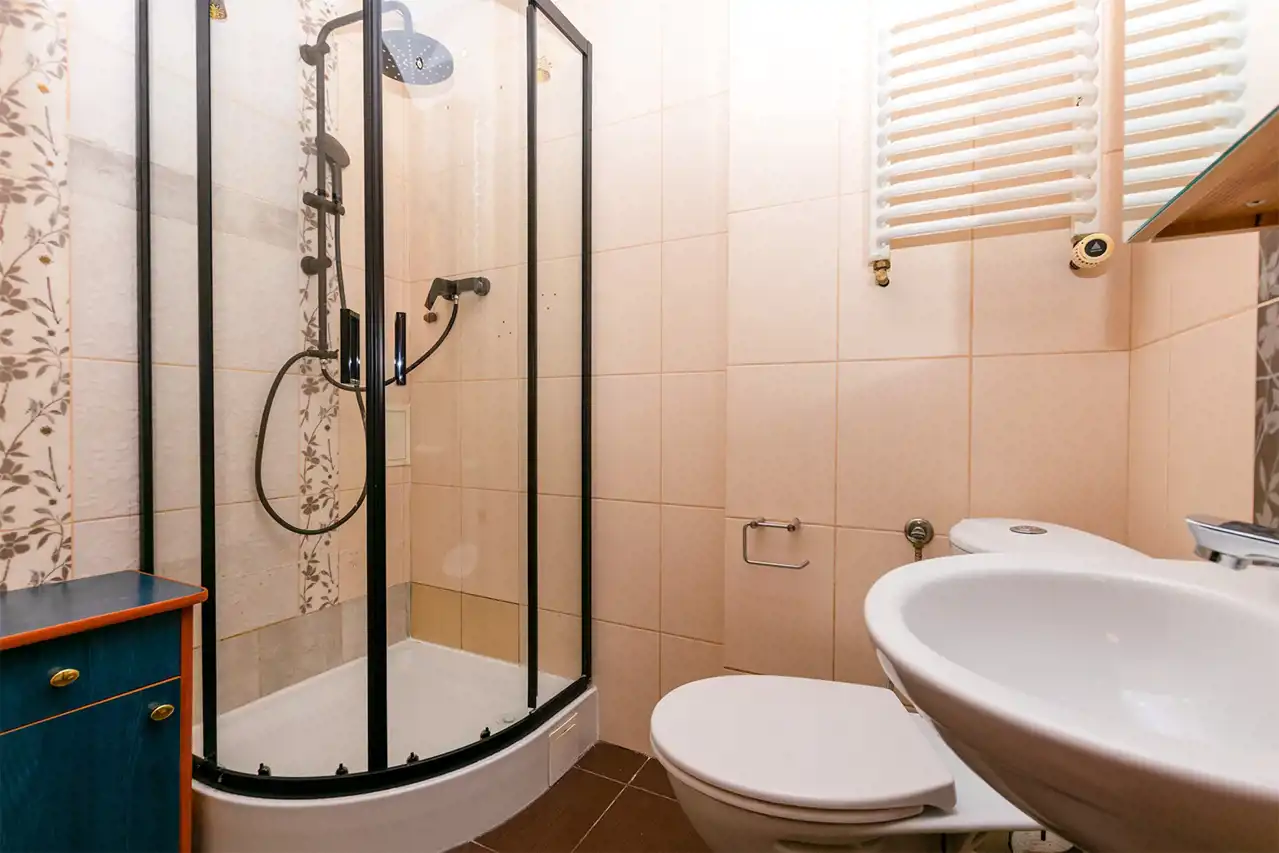 Łazienka z WC: 2,7 m², wyposażona w prysznic, zlew,