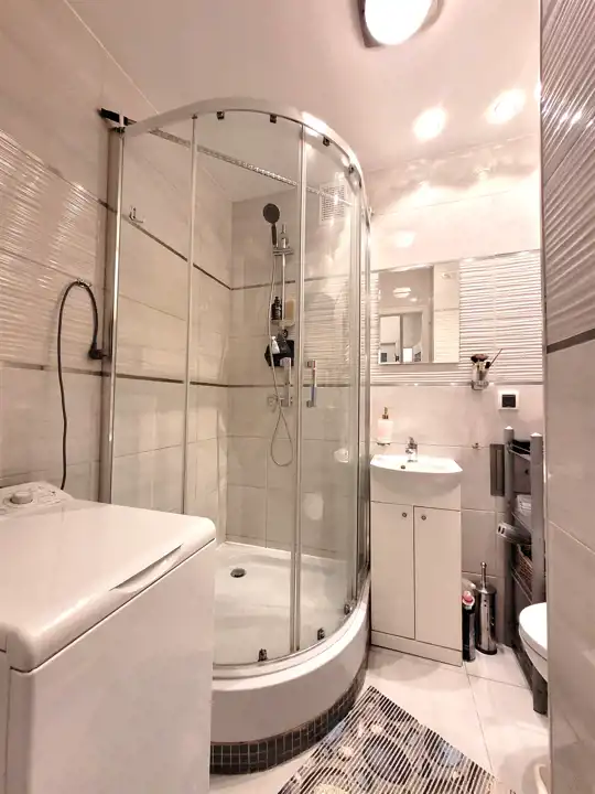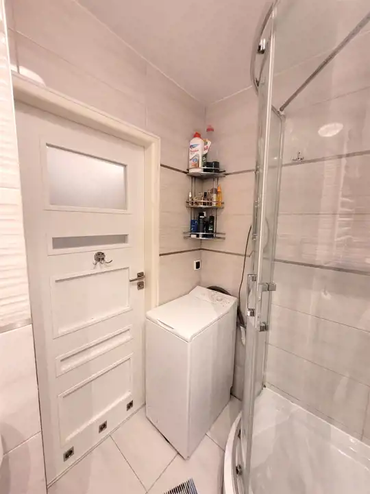 - jasna i estetyczna ŁAZIENKA razem z WC, w której znajduje się szafka z umywalką, szafka wisząca, kabina natryskowa, grzejnik drabinkowy, oraz uwzględniono miejsce na pralkę.