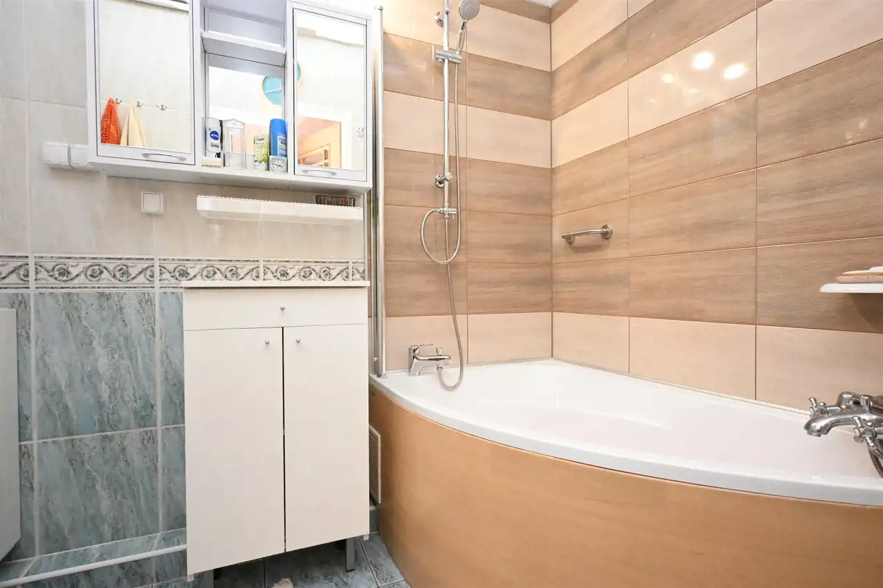 Łazienka o pow. ok. 4m2, wyposażona w wannę i szafę wnękową, pralkę