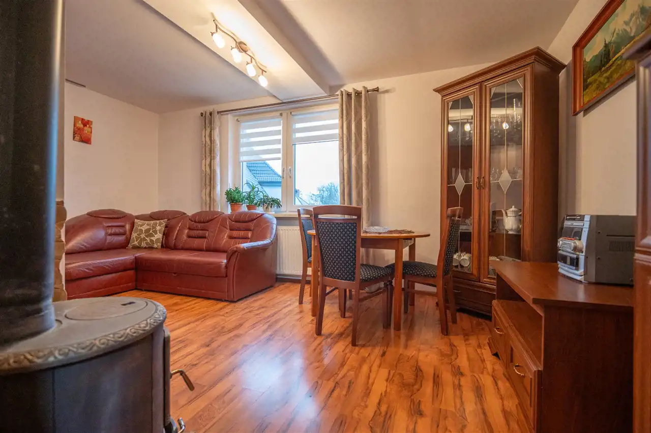 Ogrzewanie trzema źródłami ciepła : piec na paliwo stałe (piwnica), piec dwufunkcyjny gazowy i koza w salonie.