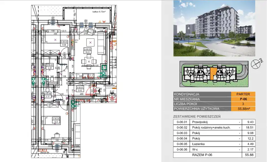 - Charakterystyka mieszkania 55.88 m2, 3 pokoje