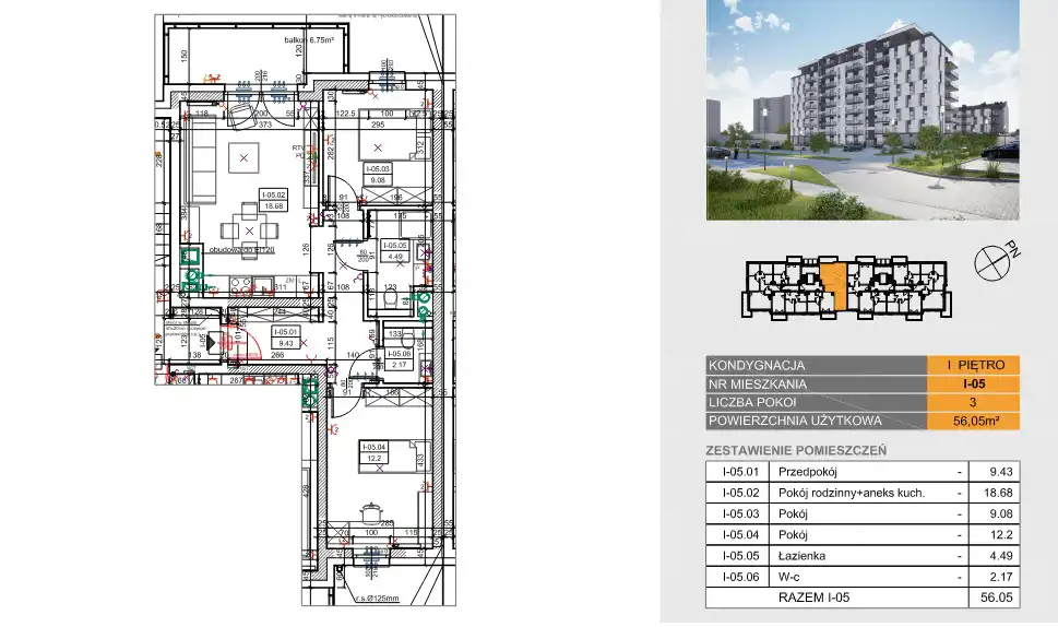 - Charakterystyka mieszkania 56.05 m2, 3 pokoje