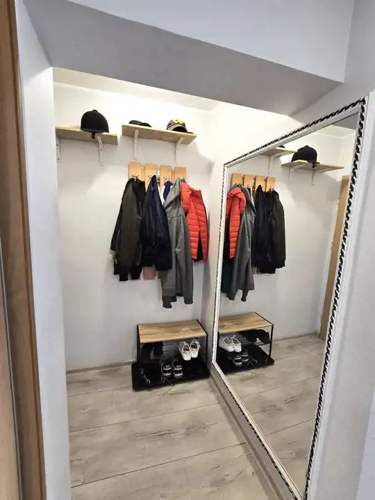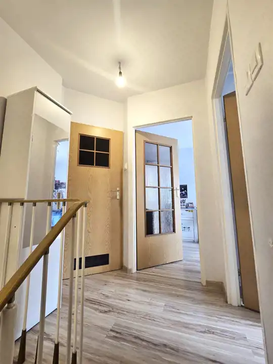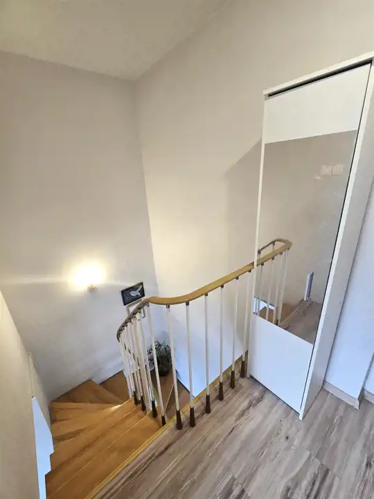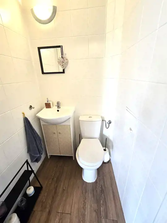 Na dole znajduje się salon z aneksem kuchennym, spiżarnią (pomieszczenie gospodarcze) oraz wc. Na piętrze lokalu znajdziemy dwa pokoje (z jednego wyjście na drugi balkon!) oraz łazienkę z wc.