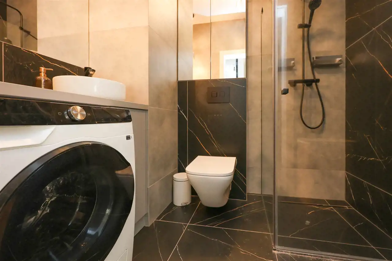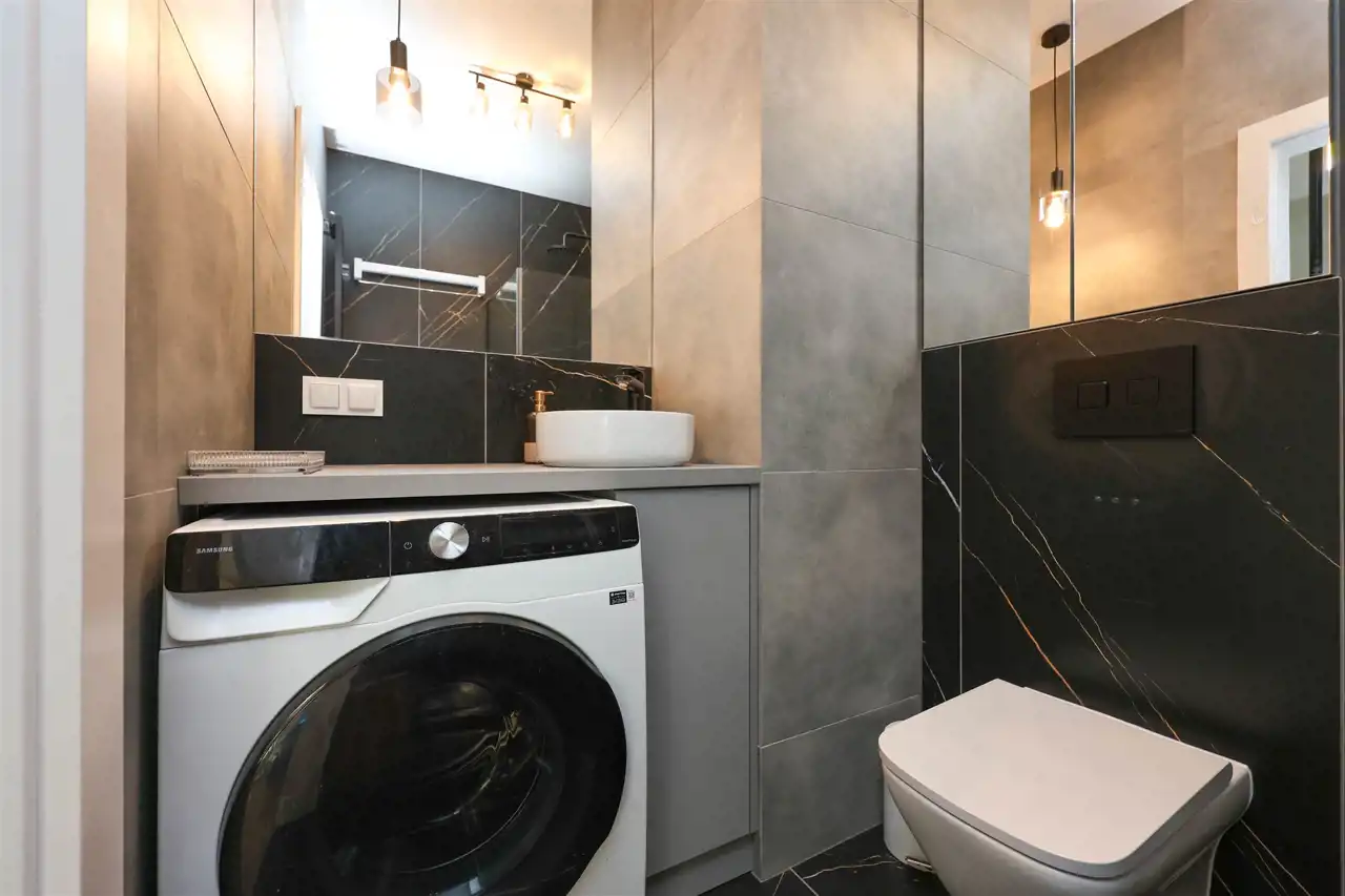 Stylowa łazienka o powierzchni 3,4m2 wyposażona w kabinę prysznicową, toaletę, szafkę z lustrem, szafkę pod umywalką, lustro i pralko-suszarkę.