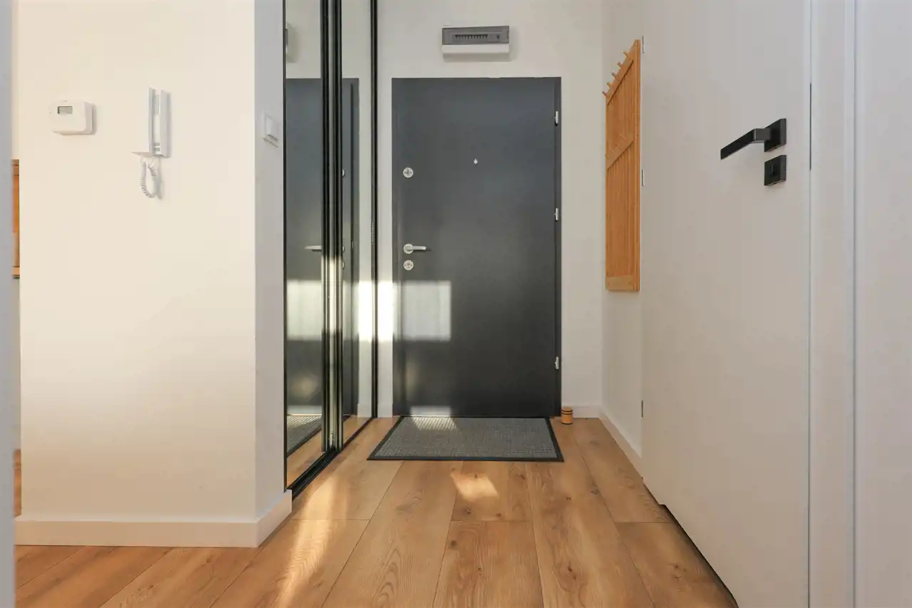 Przedpokój o powierzchni 3,91m2 wyposażony w dużą szafę z drzwiami przesuwne typu komandor.