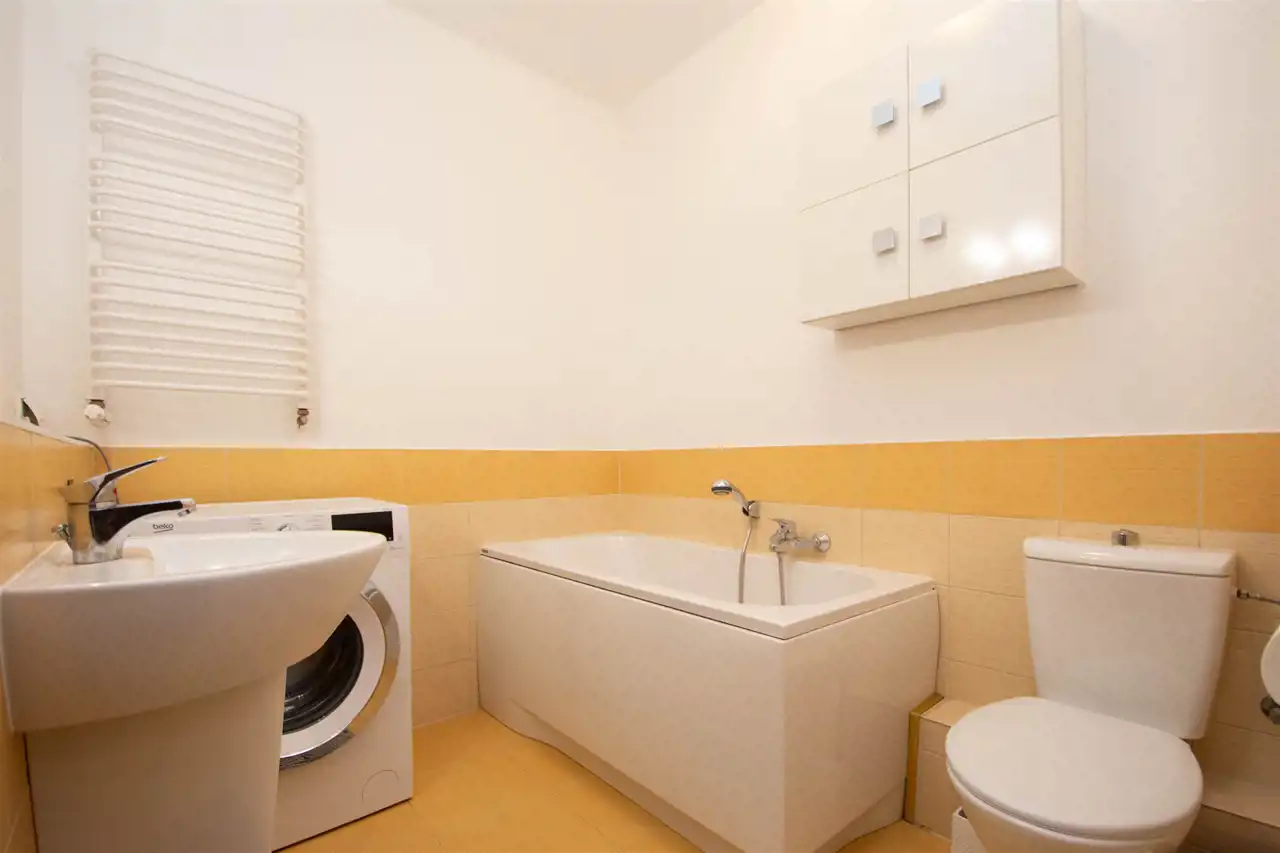 - łazienka o powierzchni 4,08 m2 wyposażona w pralkę, toaletę, szafkę, lustro oraz wannę