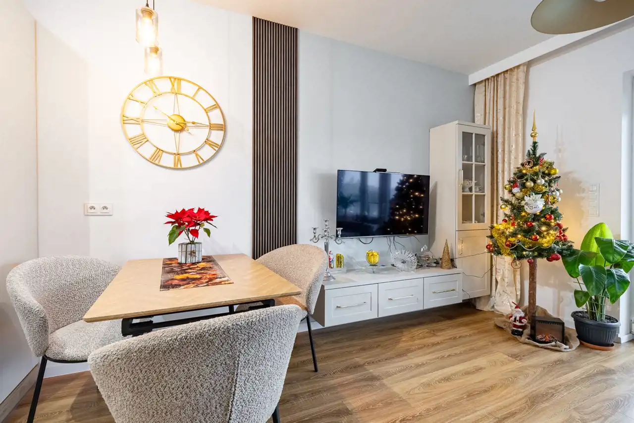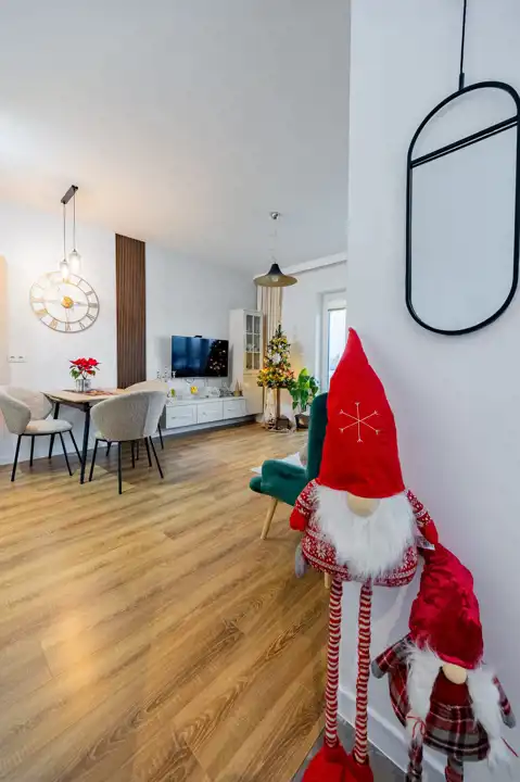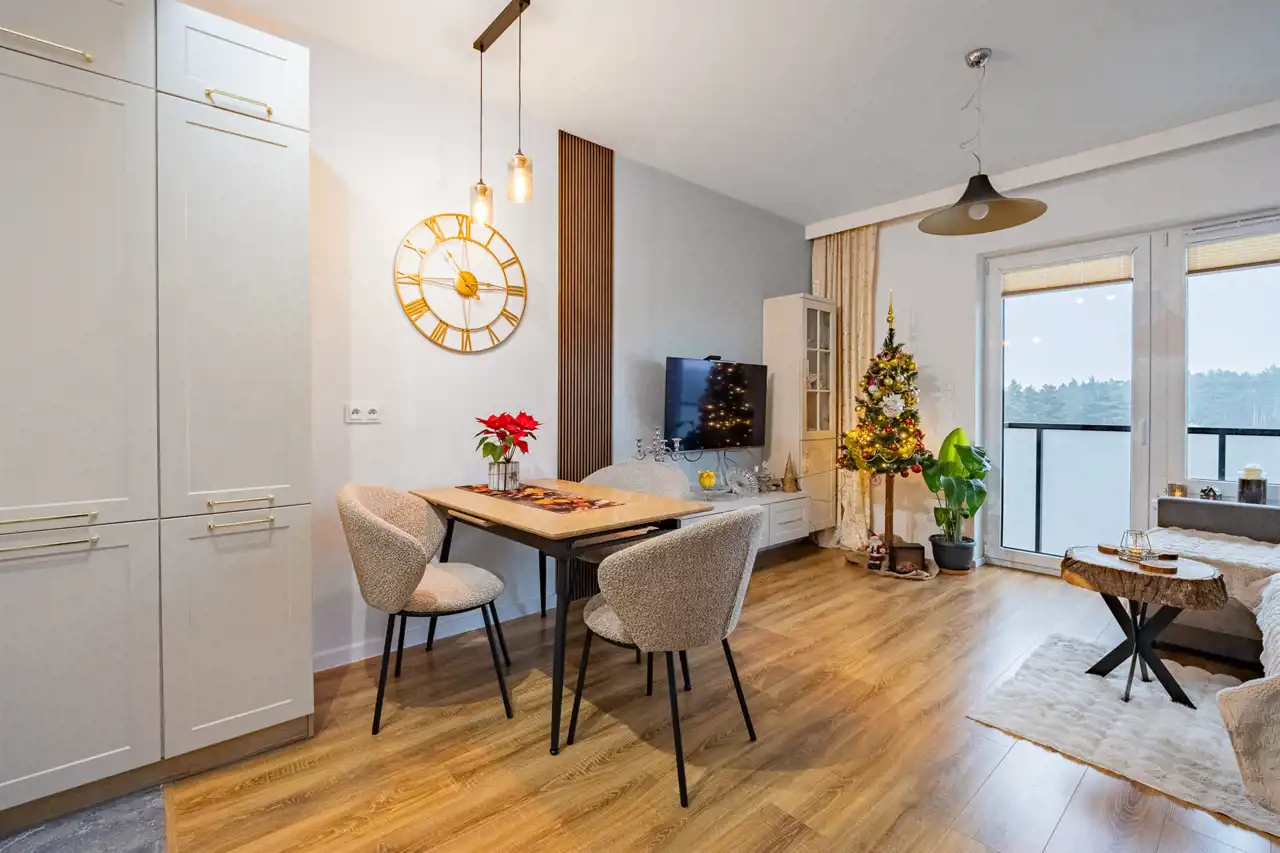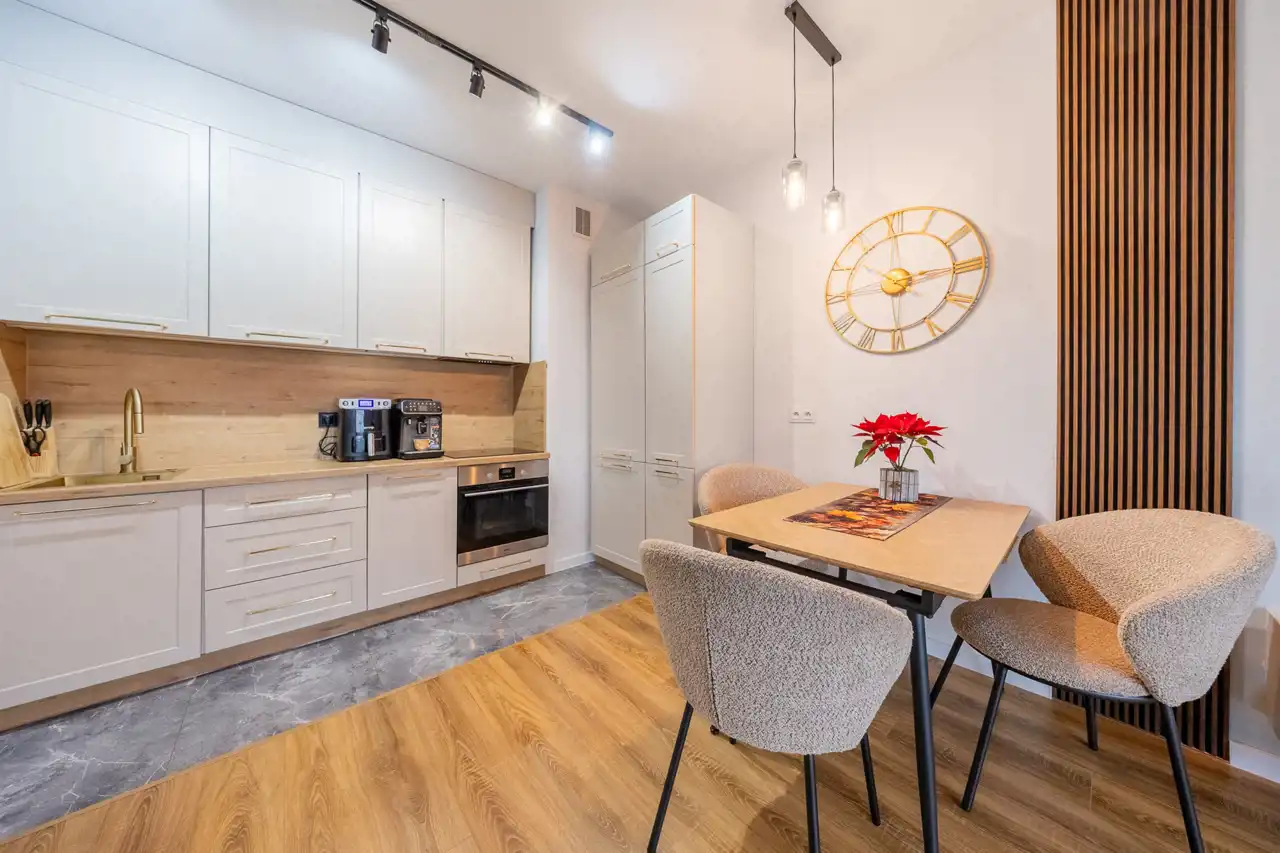 Kuchnia została wykończona wysokiej klasy zabudową na wymiar wraz z kompletnym sprzętem AGD, co pozwala nowemu właścicielowi wprowadzić się bez konieczności dodatkowych nakładów.
