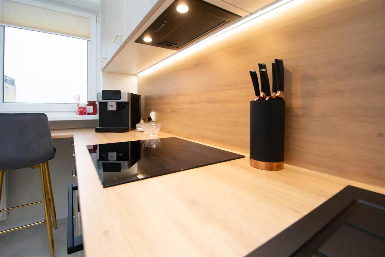 Standard wykończenia i wyposażenie: nowoczesna kuchnia w zabudowie, wyposażona w nowy sprzęt AGD: zmywarkę Beko, piekarnik elektryczny, płytę indukcyjną, okap kuchenny oraz lodówko-zamrażarkę Hisense, mikrofalówkę Gorenje, ekspres Beko z możliwością sterowania smartfonem.