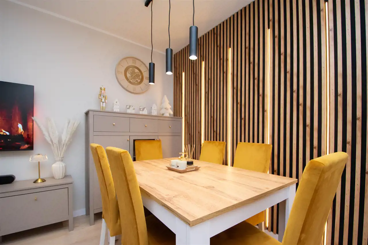 - salon o powierzchni 16,70 m² : w pełni umeblowany z rtv ambilight, na jednej ze ścian stylowe lamele z oświetleniem led, listwa oświetleniowa trójfazowa.
