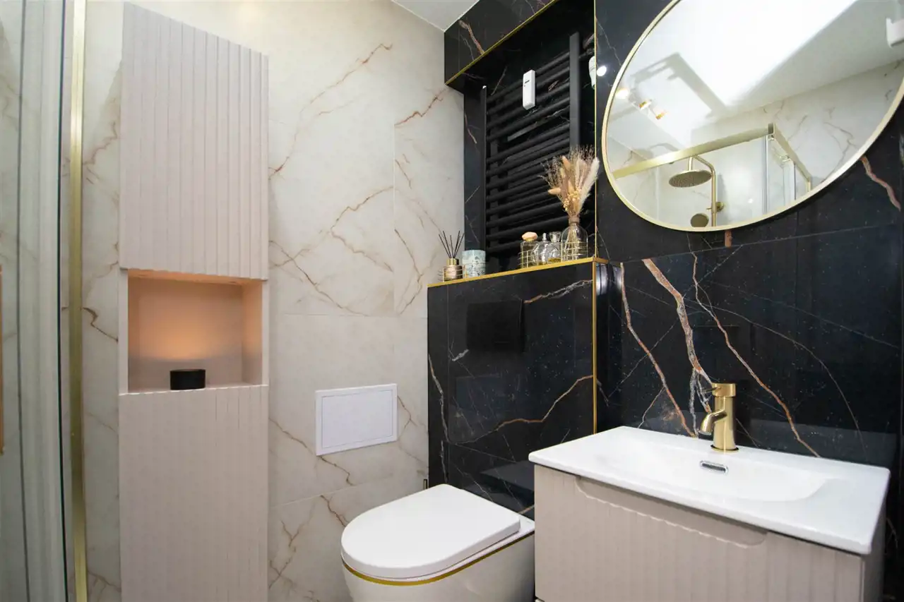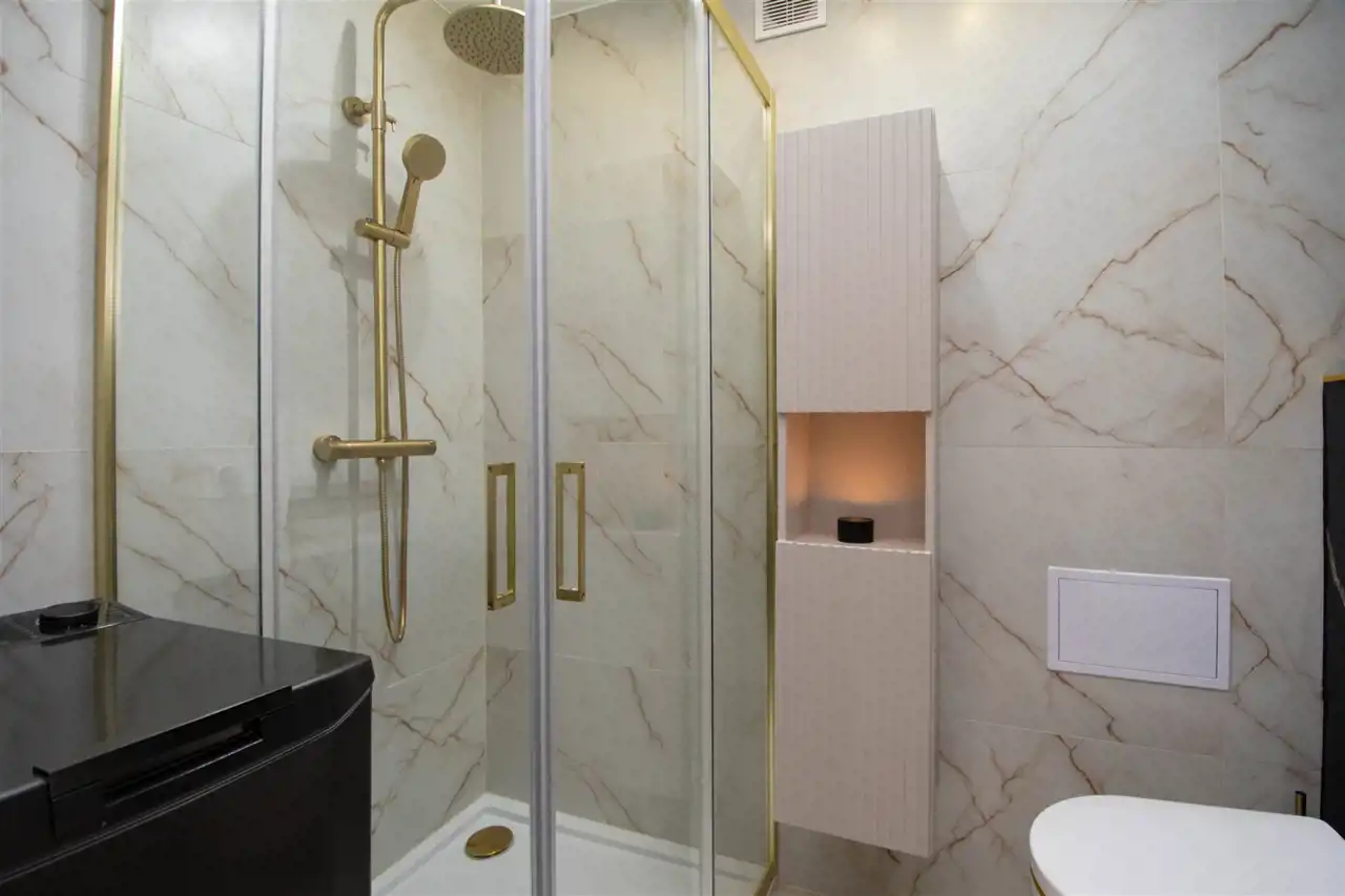Elegancka, nowoczesna łazienka z glazurą wysokiej jakości oraz kabiną prysznicową z odpływem liniowym oraz pralkę Haier z możliwością sterowania smartfonem. Estetyczne i spójne wykończenie wnętrz, sprzyjające codziennemu komfortowi.