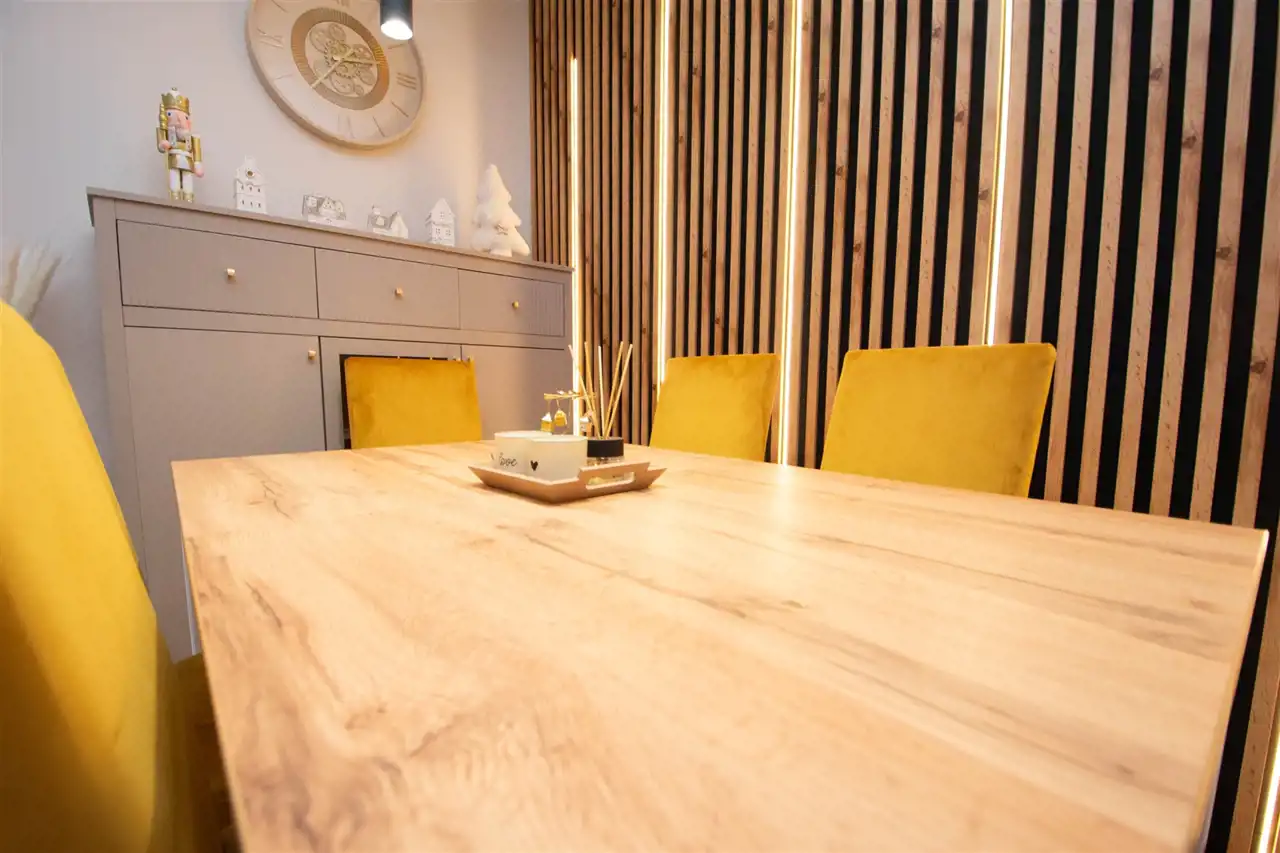 - salon o powierzchni 16,70 m² : na podłodze panele, ściany malowane, stylowe lamele na jednej ze ścian wraz oświetleniem LED.