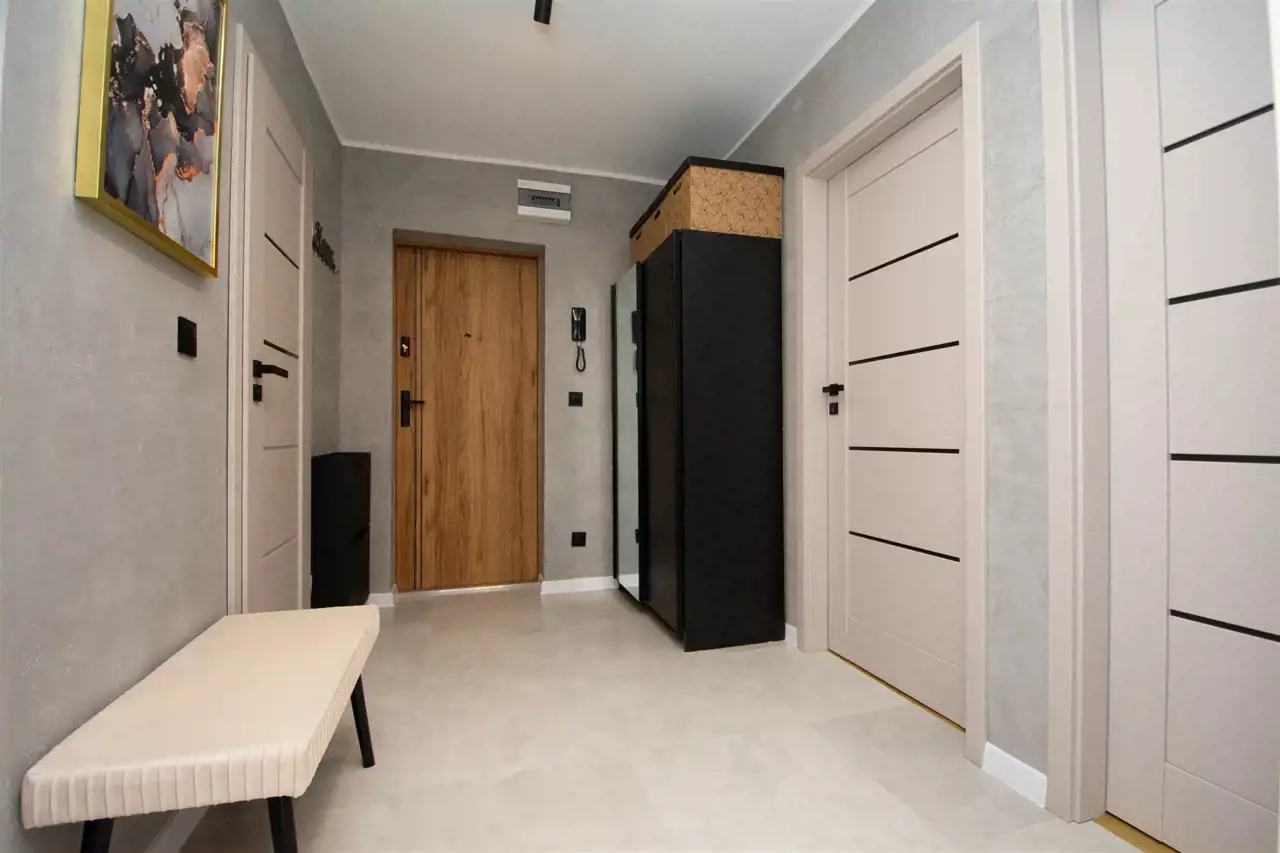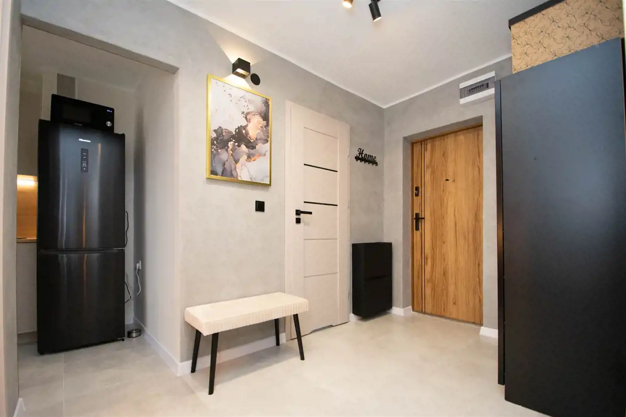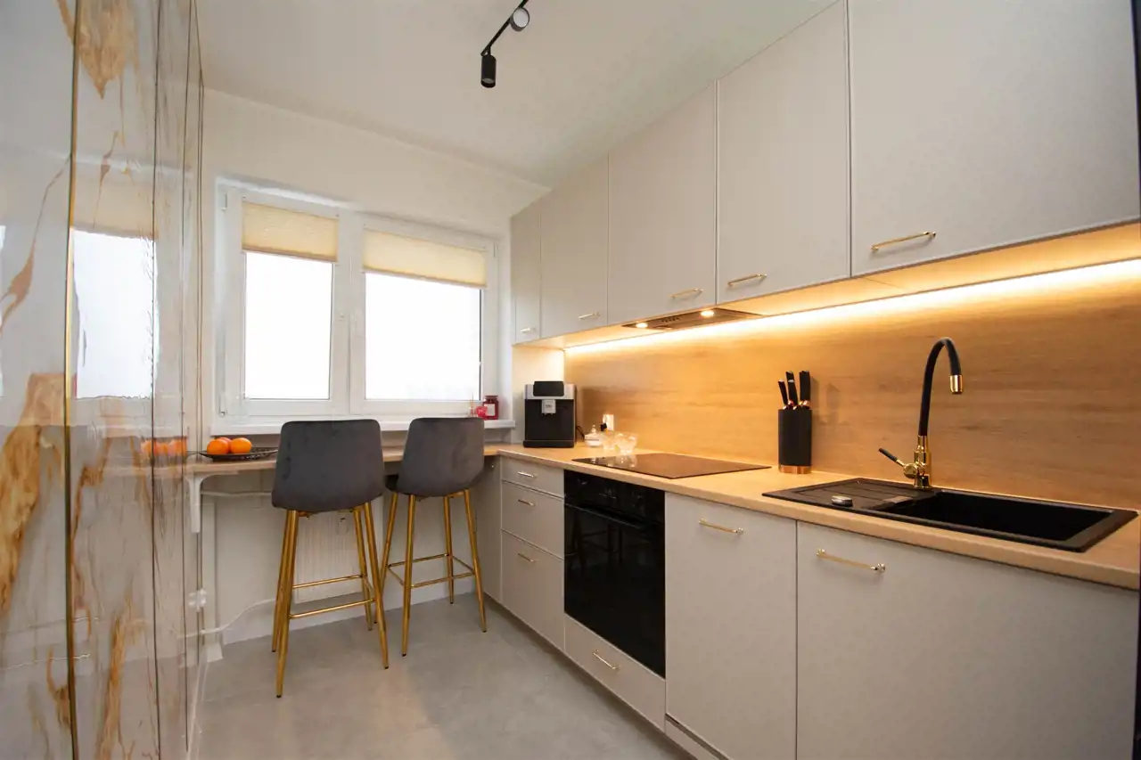 Standard wykończenia i wyposażenie: nowoczesna kuchnia w zabudowie, wyposażona w nowy sprzęt AGD: zmywarkę Beko, piekarnik elektryczny, płytę indukcyjną, okap kuchenny oraz lodówko-zamrażarkę Hisense, mikrofalówkę Gorenje, ekspres Beko z możliwością sterowania smartfonem.
