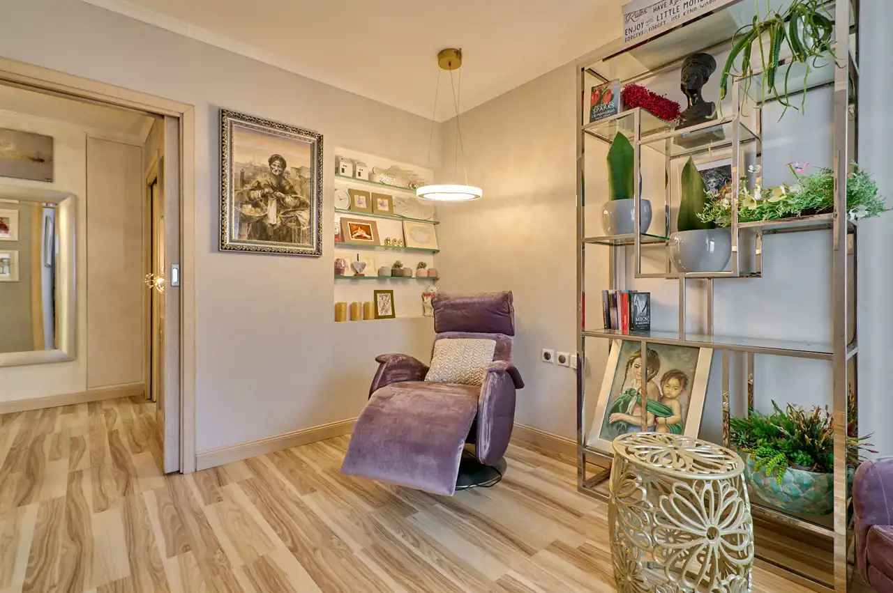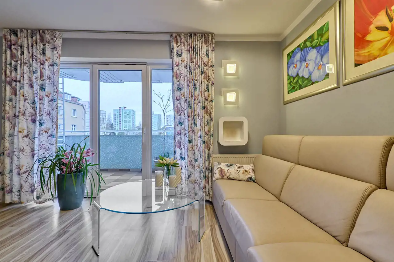 Niewątpliwym atutem mieszkania jest duży salon z bardzo nowoczesnym wyposażeniem, w którym znajduje się bio kominek oraz szafa w zabudowie. Przesuwnymi drzwiami tarasowymi ( systemy HST) wychodzimy na słoneczny taras, który zaskakuje nas automatycznym nawadnianiem roślin, dzięki temu nie musimy martwić się o zieleń podczas długich urlopów.