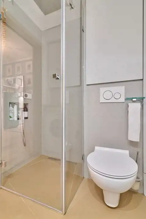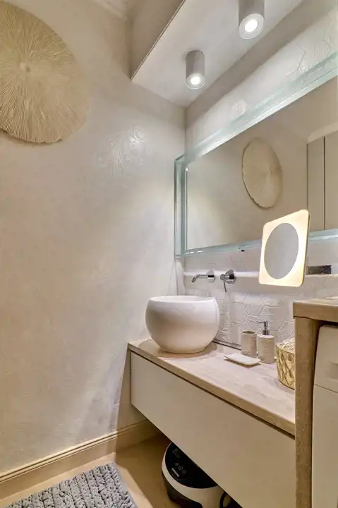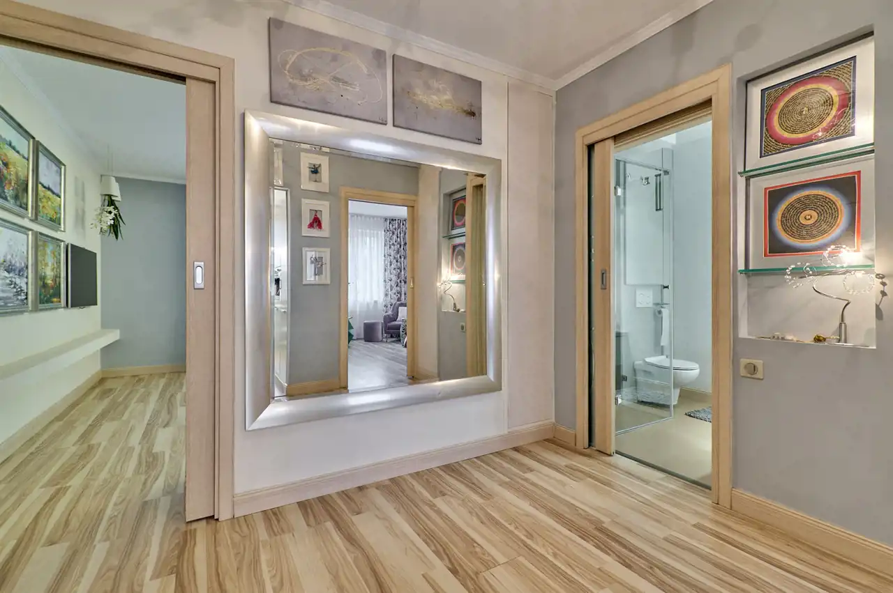 W łazience nowoczesna deszczownica z panelem elektronicznym sterującym temperaturą wody firmy Tres. Pokój wyposażony w meble włoskie . W całym mieszkaniu wewnętrzne drzwi przesuwne z matowego szkła. Wszystkie pomieszczenia posiadają osobny sterownik centralnego ogrzewania. W przedpokoju szafki w zabudowie oraz ogromne lustro o pow. 2,30 m2!