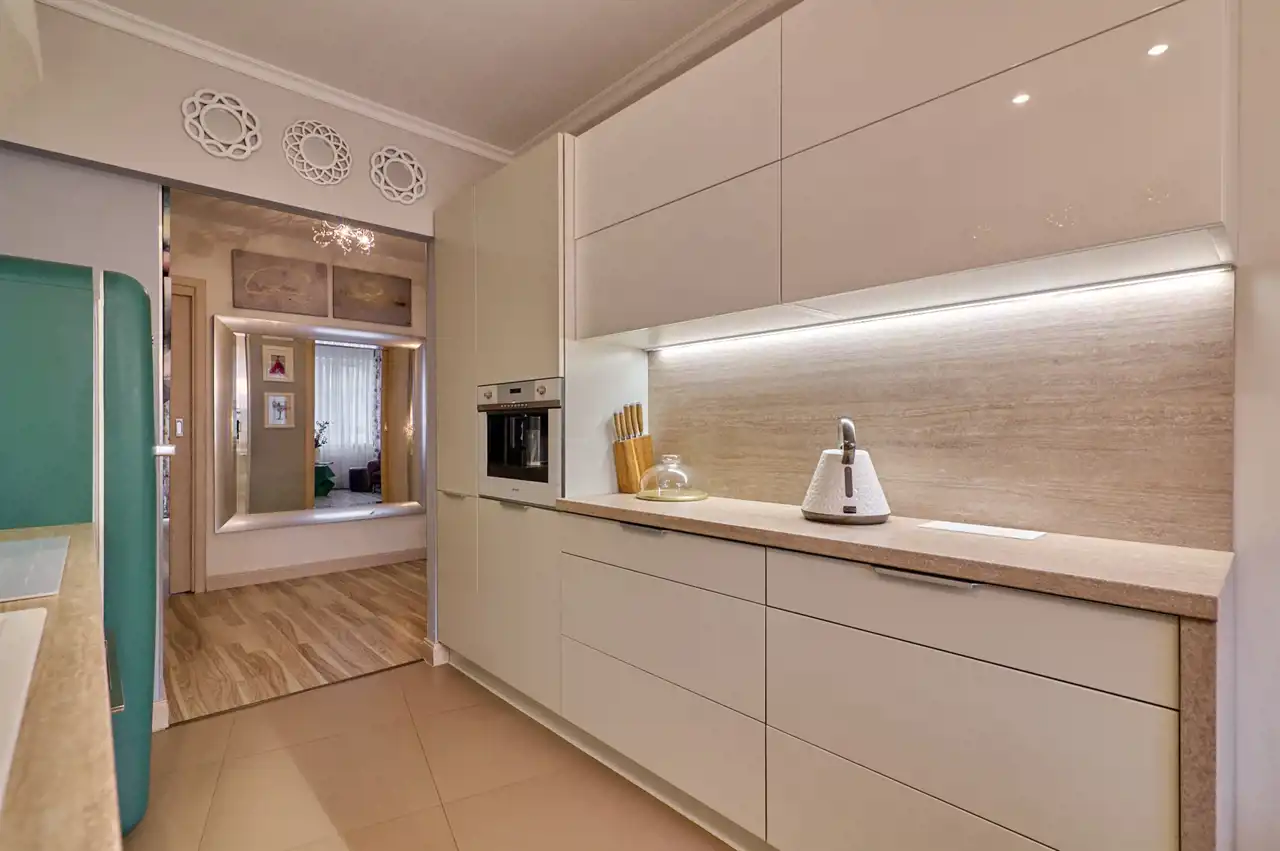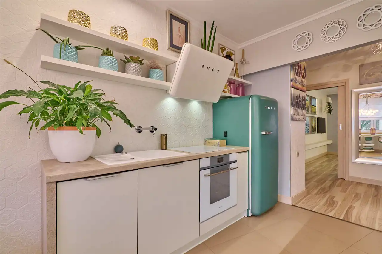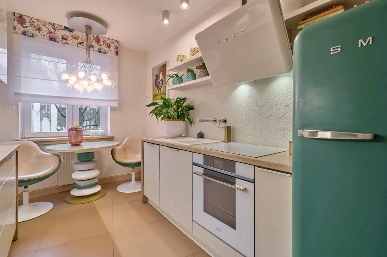 Kuchnia zabudowana meblami na systemach z najwyższej światowej półki, ponadto wyposażona z najwyższej klasy sprzętem AGD firmy Smeg (lodówka, płyta indukcyjna, okap oraz ekspres do kawy w zabudowie, zmywarka firmy Ariston, armatura firmy Tres.