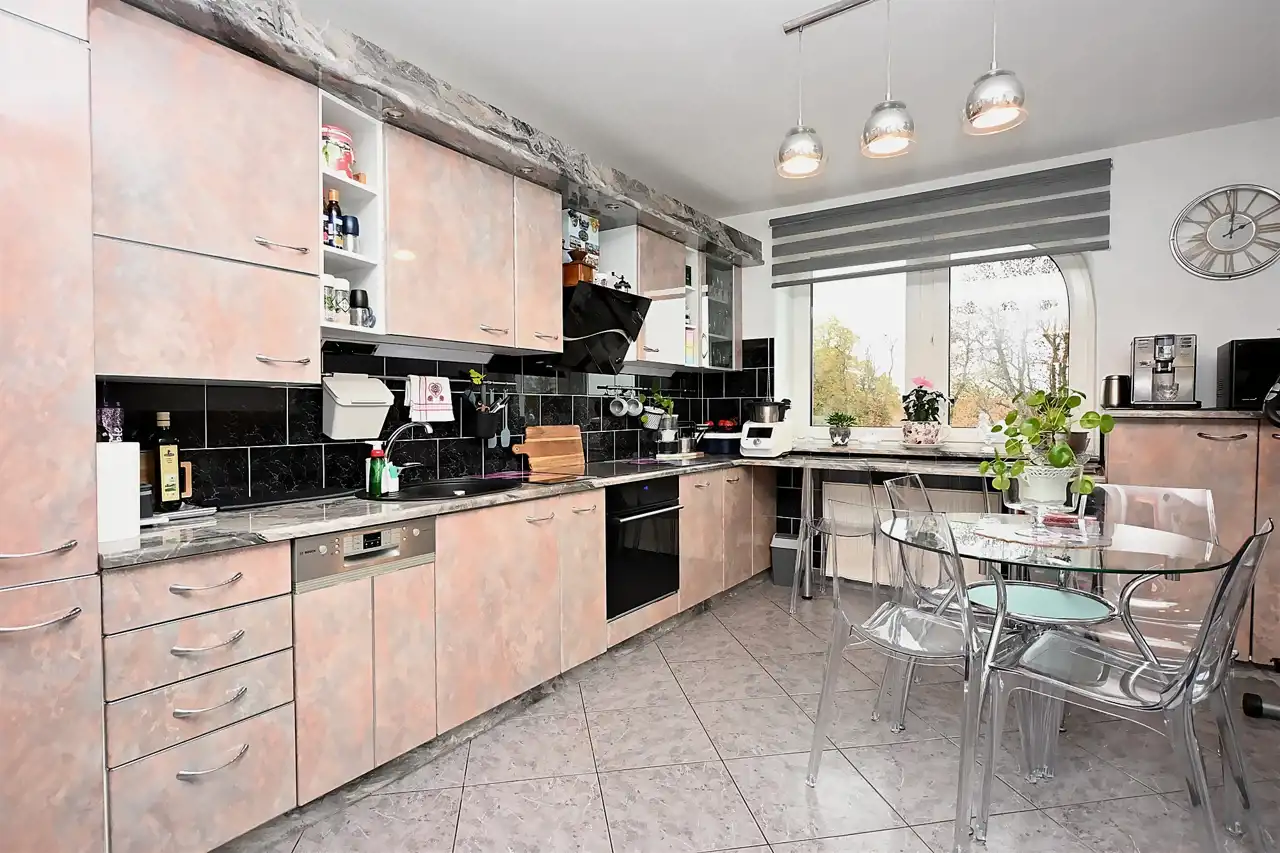 Kuchnia o pow. ok. 15m2. Meble kuchenne ze sprzętem AGD. Przestronna, jasna kuchnia z częścią jadalnianą, sprzyjająca rodzinnej atmosferze