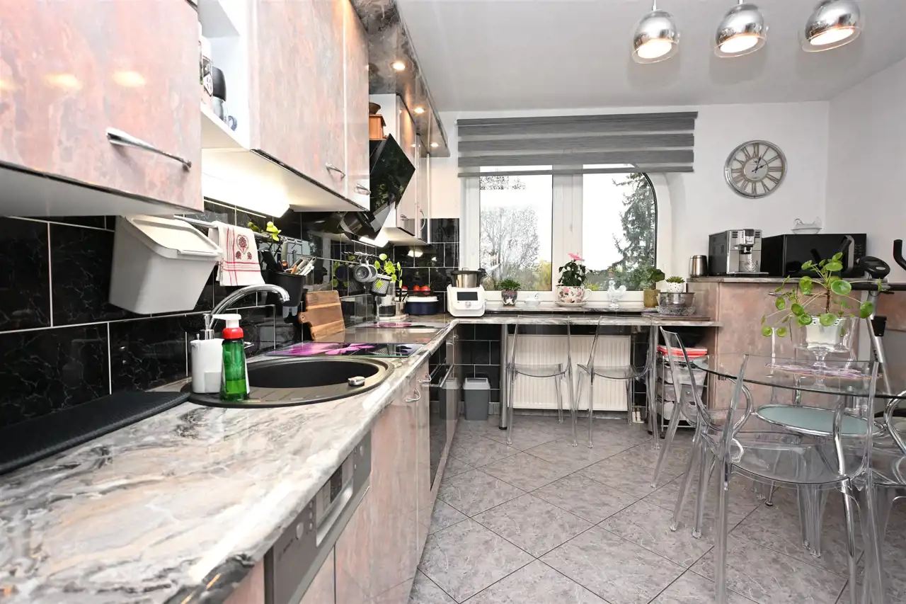 Lokalizacja to jeden z atutów tego mieszkania. W pobliżu znajduje się pełna infrastruktura usługowa: market, punkty medyczne, zakłady usługowe, szkoły, przedszkola oraz miejska wyspa zapewniające chwile relaksu a także atrakcje dla najmłodszych. Widok z kuchni na pięknie zagospodarowany i odnowiony teren zielony