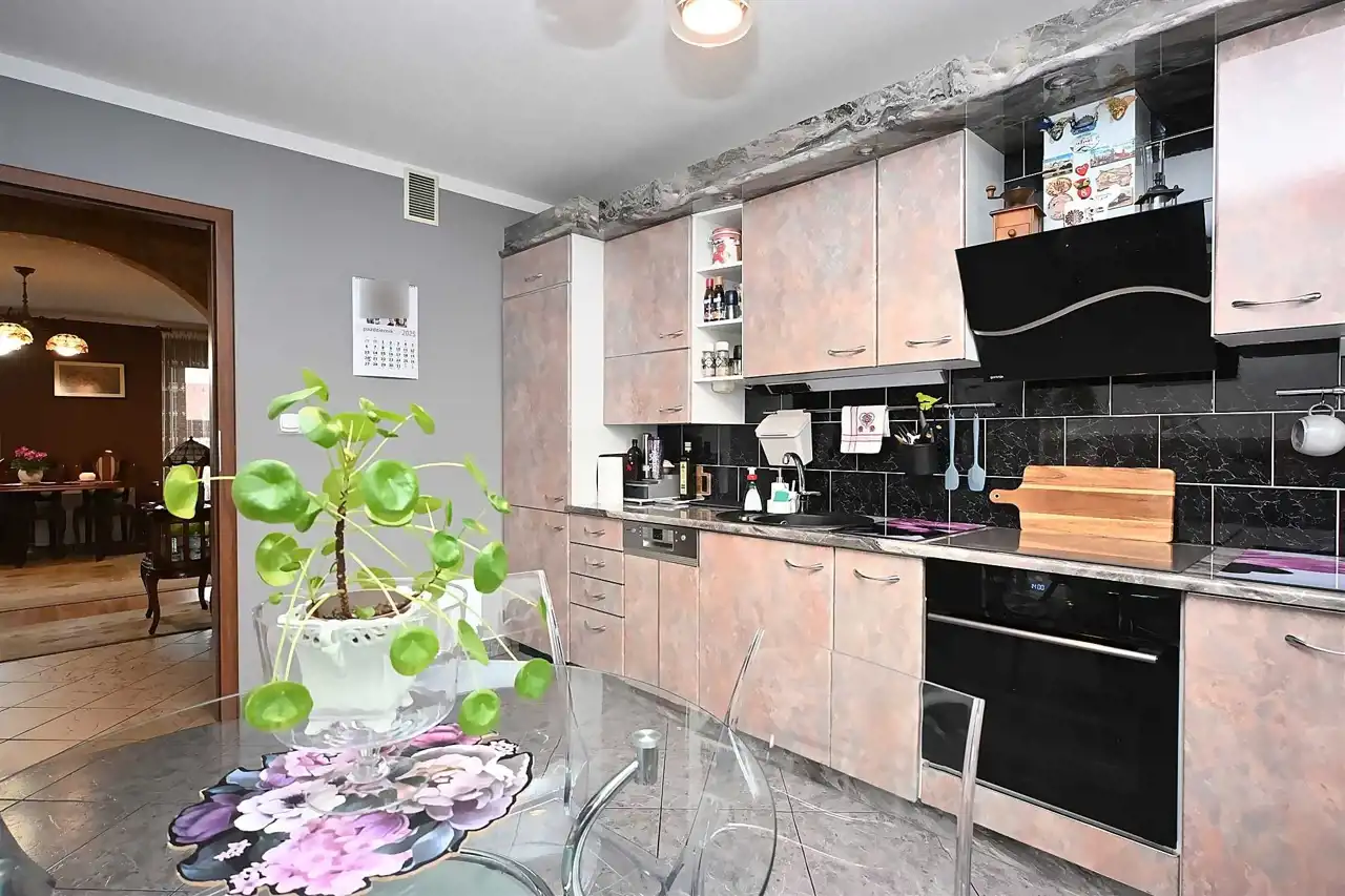 Kuchnia o pow. ok. 15 m2. Meble kuchenne ze sprzętem AGD. Przestronna, jasna kuchnia z częścią jadalnianą, sprzyjająca rodzinnej atmosferze