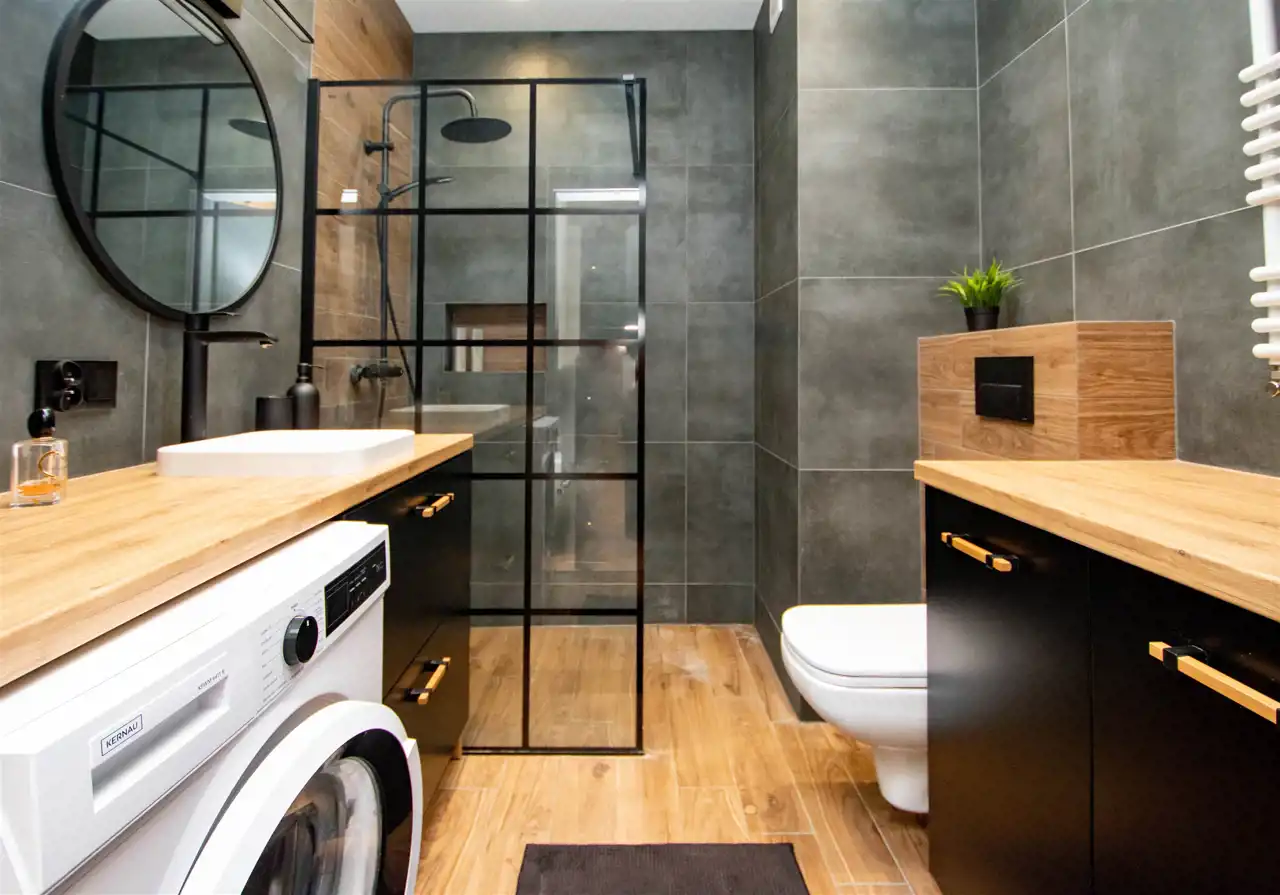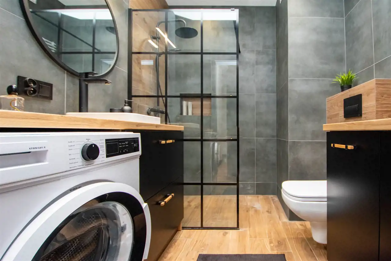 - nowoczesna łazienka o powierzchni 4,49 m2 wyposażona w pralkę, toaletę, szafkę pod umywalkę, stylowe lustro oraz prysznic.