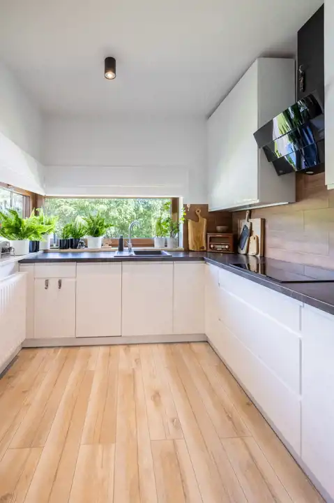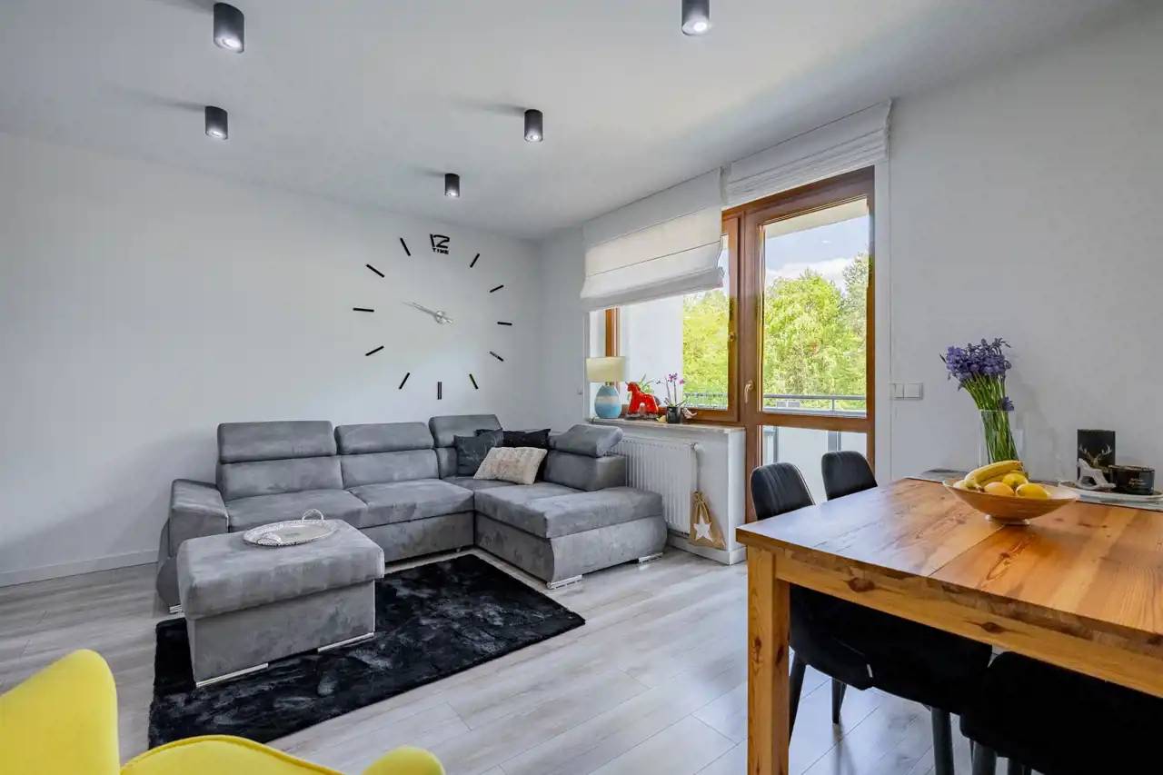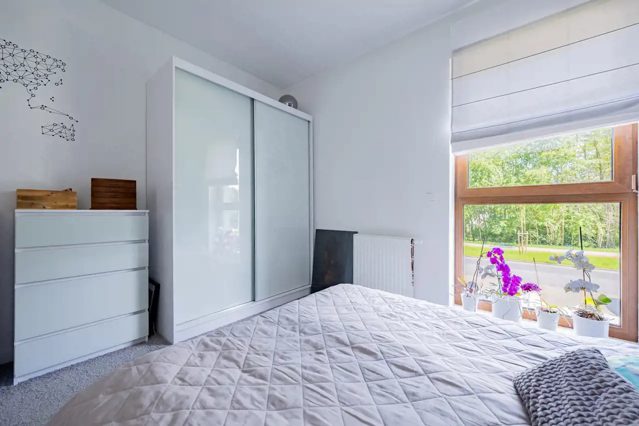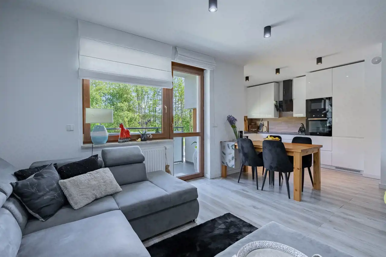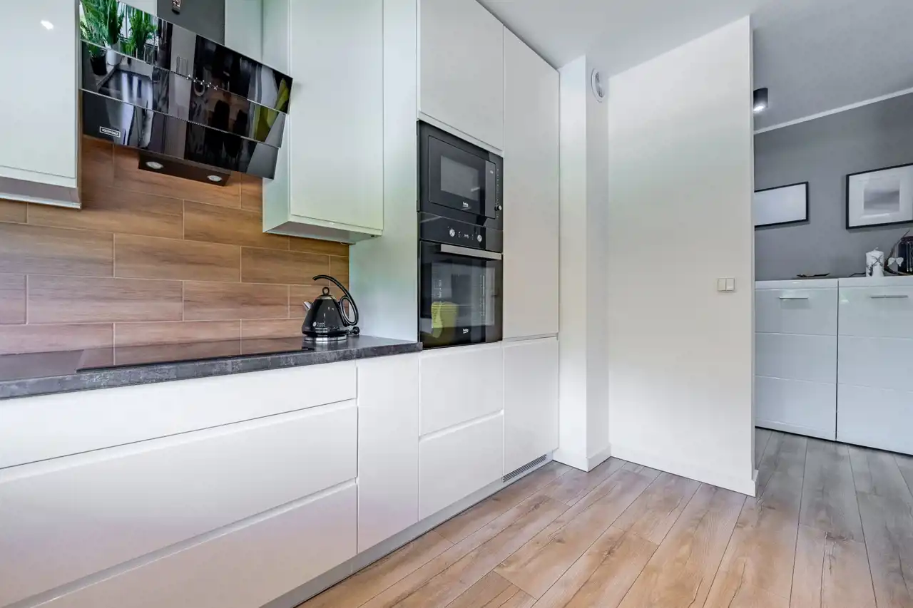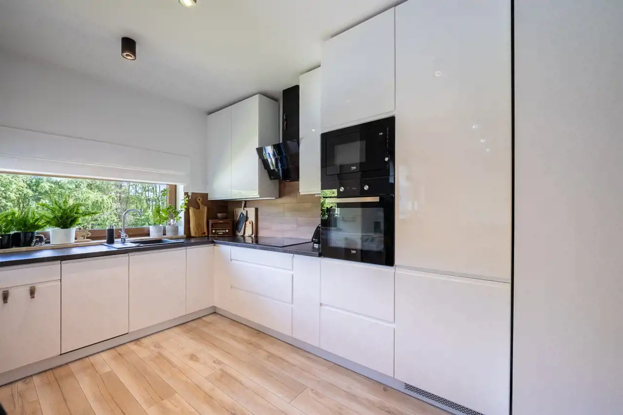 - Nowoczesna kuchnia: W pełni wyposażona (z nowym sprzętem AGD), z eleganckimi białymi szafkami i przestronnym blatem, z widokiem na zieleń drzew. Gotowanie w takim otoczeniu to czysta przyjemność!