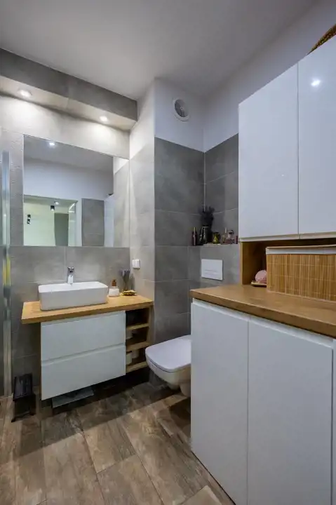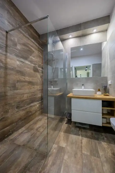 - Elegancka łazienka z prysznicem: Urządzona ze smakiem, z wygodnym prysznicem typu walk-in.