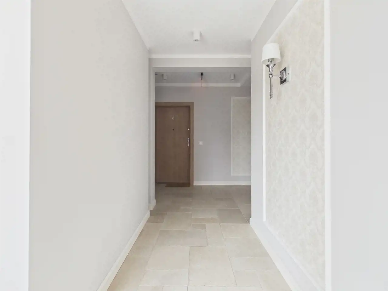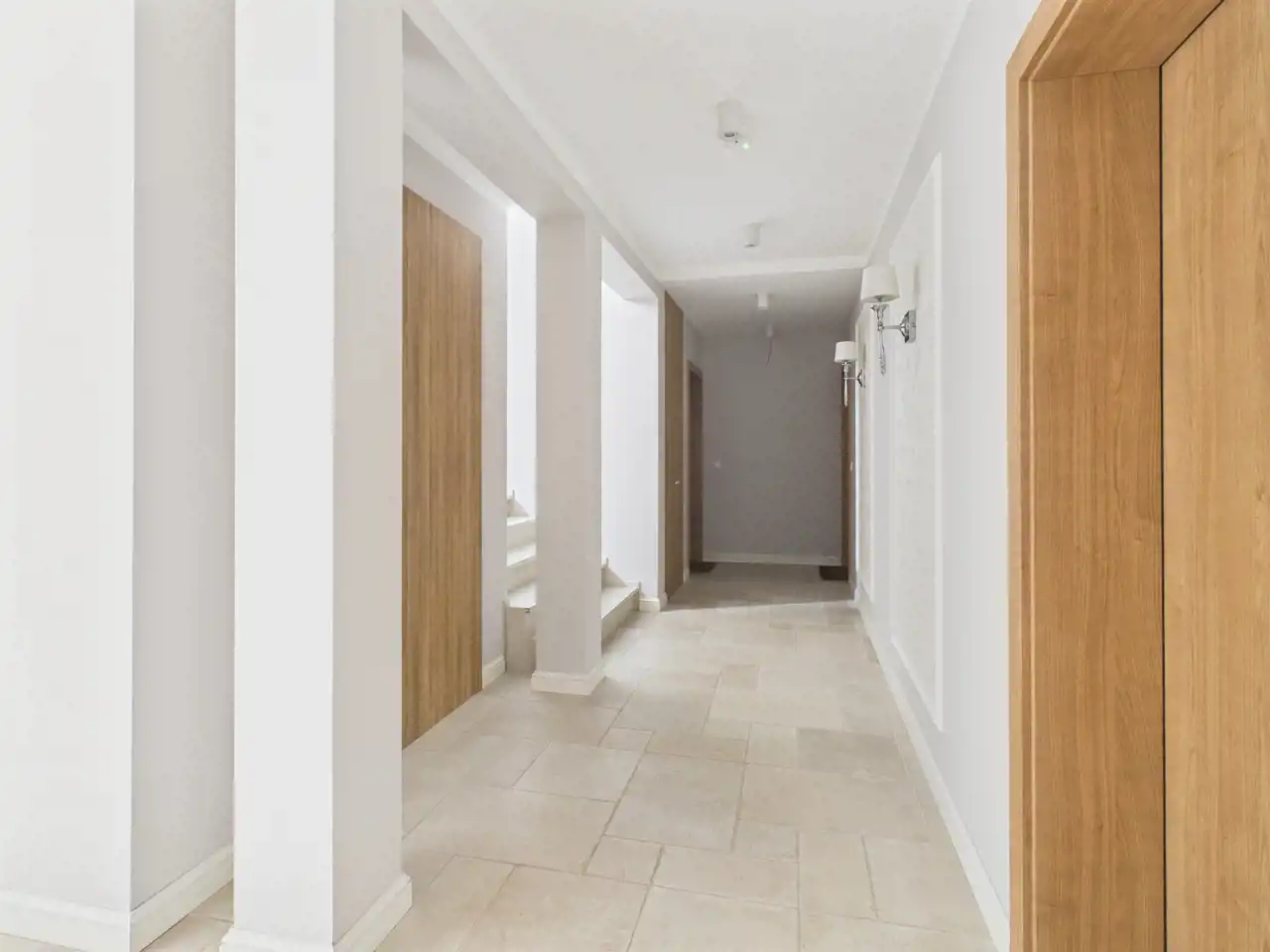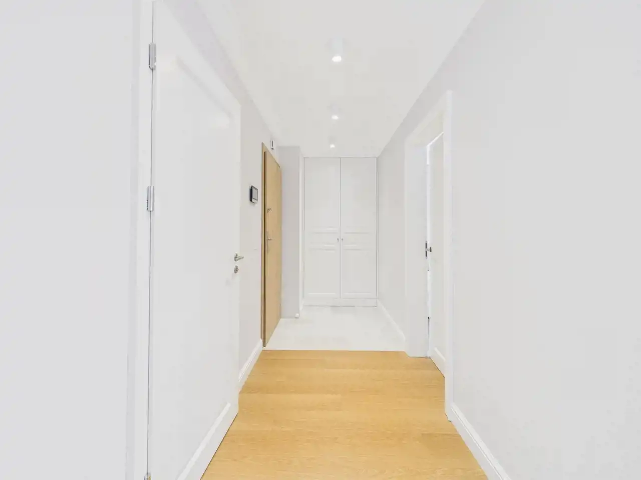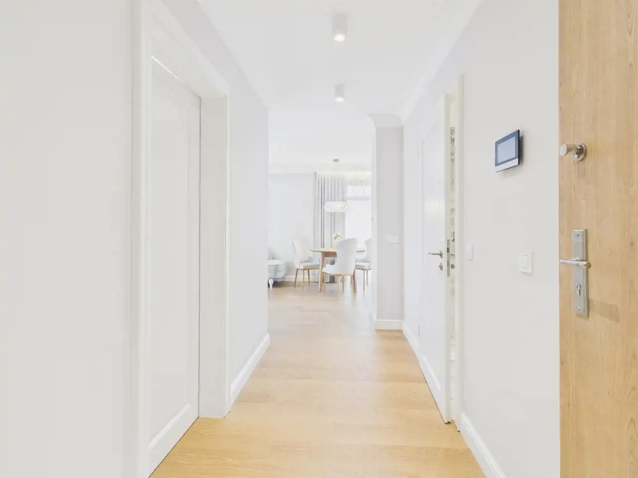 Korytarz: wygodny ciąg komunikacyjny– wideodomofon, zabudowa na wymiar z podświetleniem oferuje praktyczną przestrzeń do przechowywania.