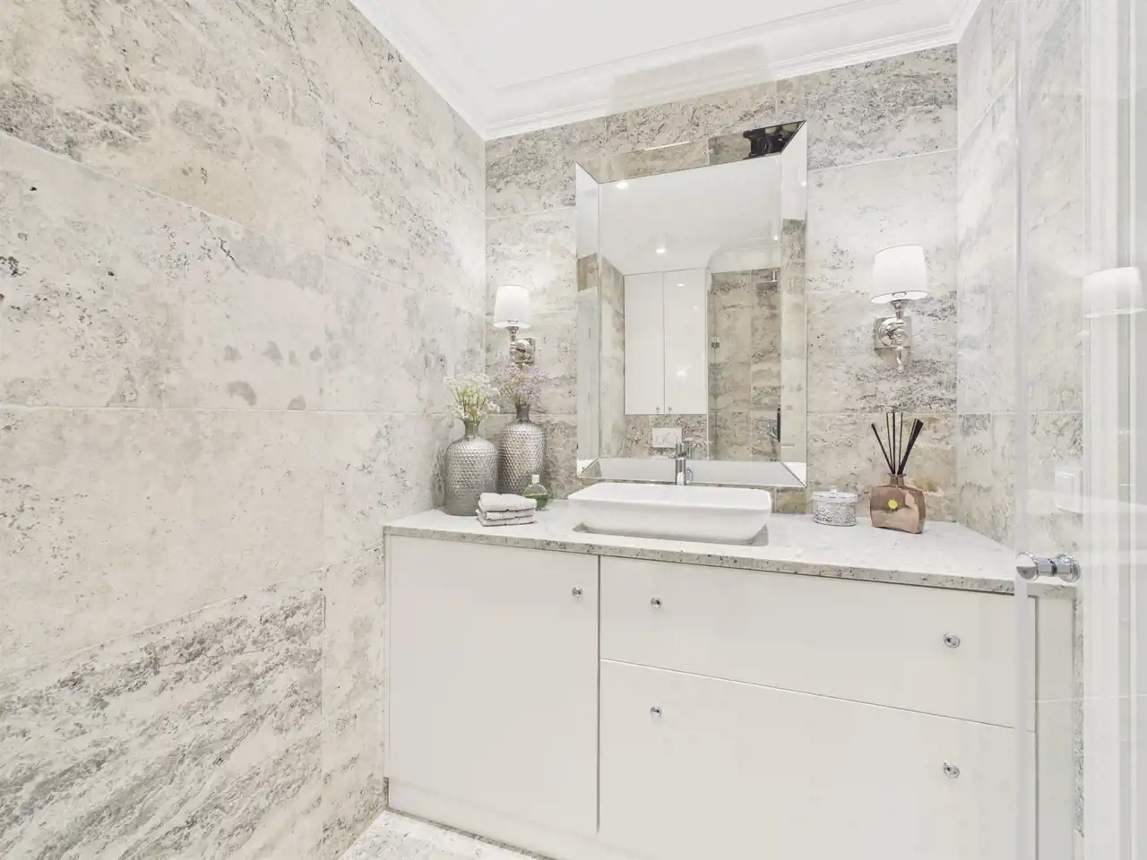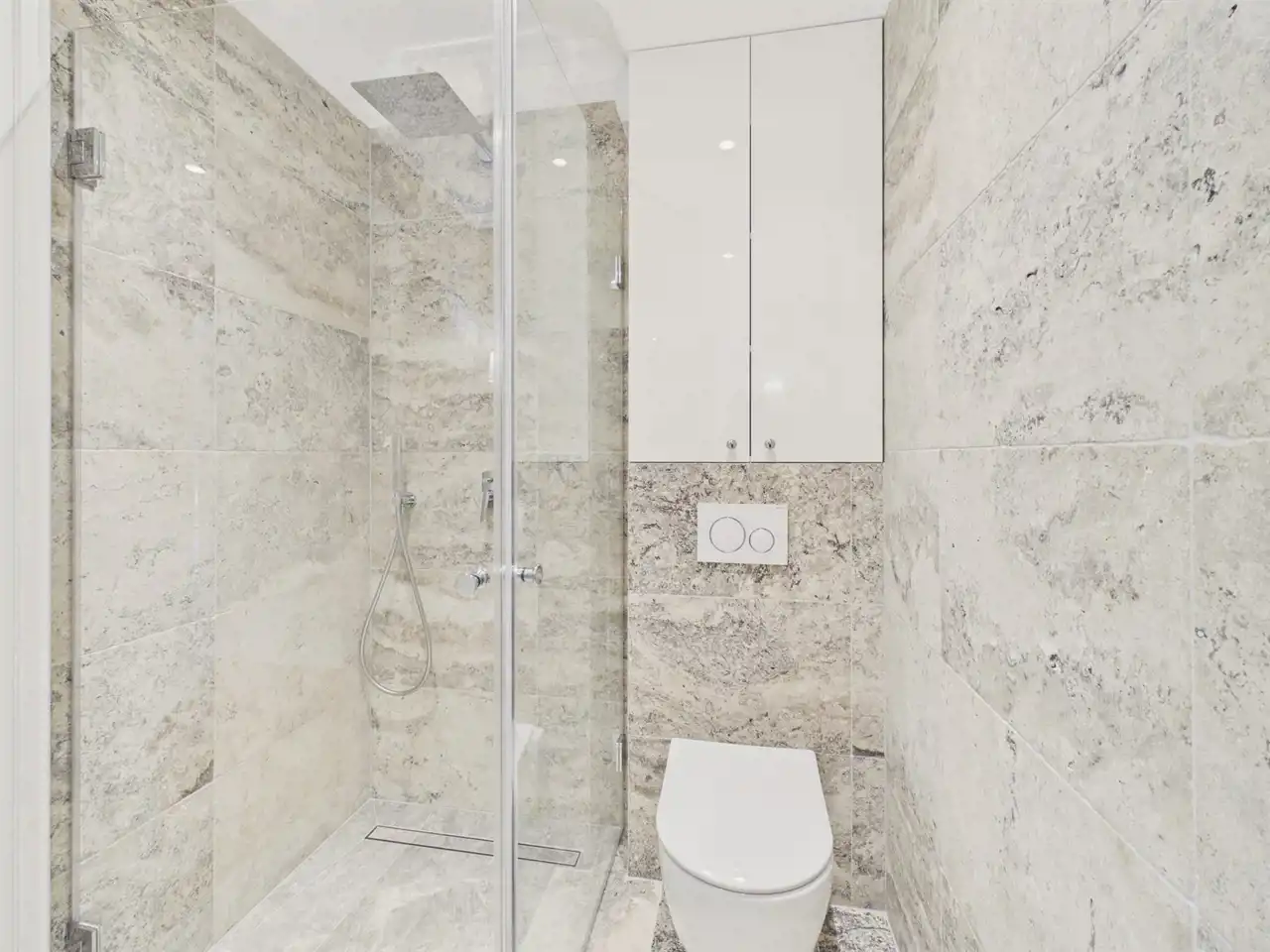 Łazienka: naturalny materiał (trawertyn) nadaje charakteru, a przemyślane rozwiązania, jak ukryta strefa prania czy wygodna kabina prysznicowa, dbają o codzienną funkcjonalność