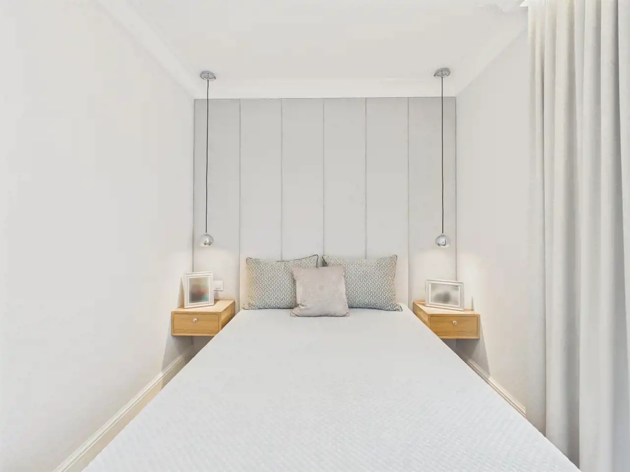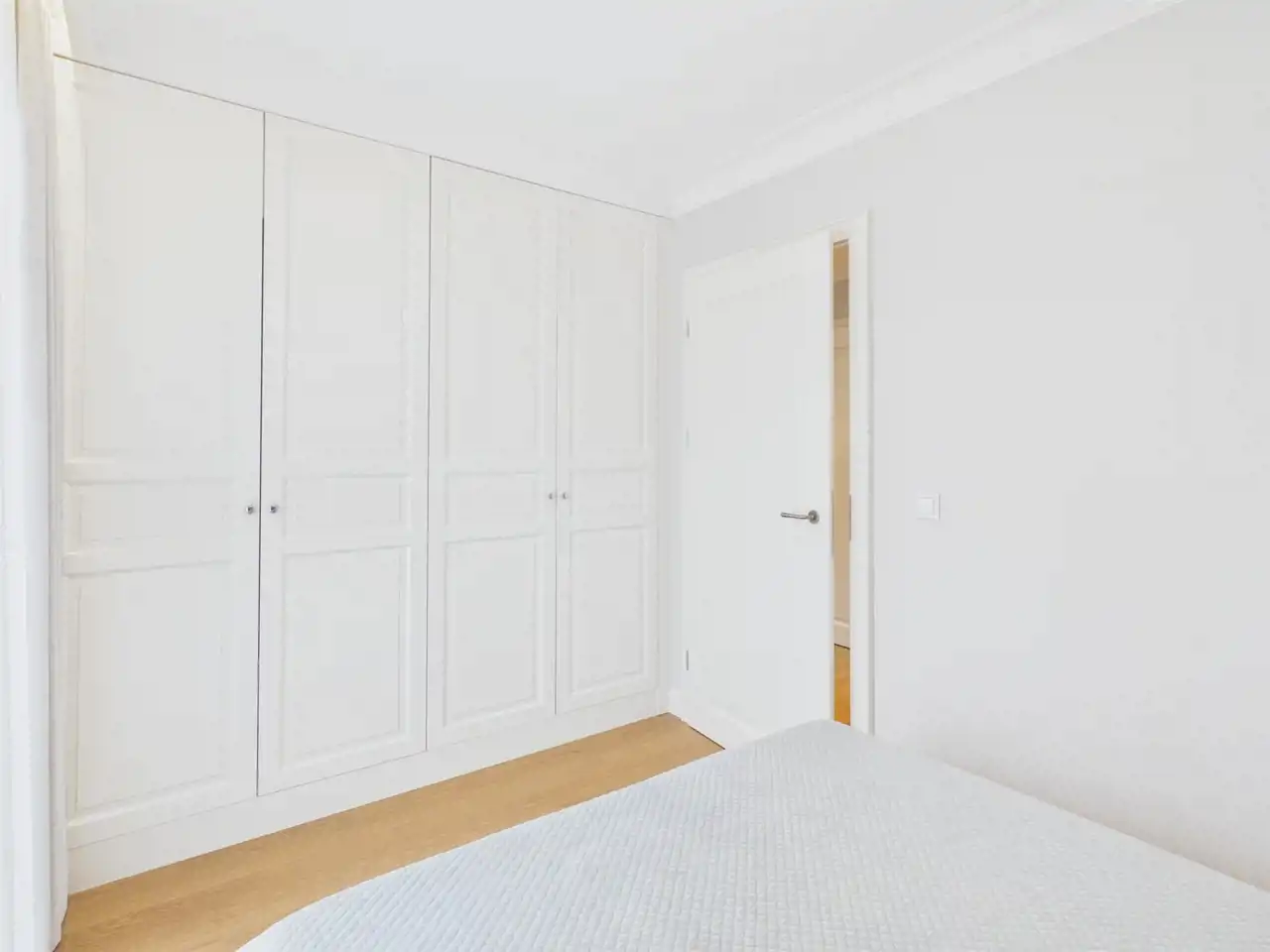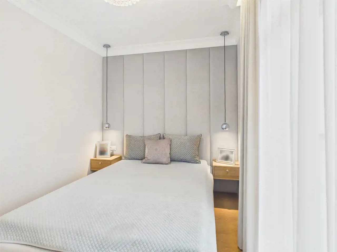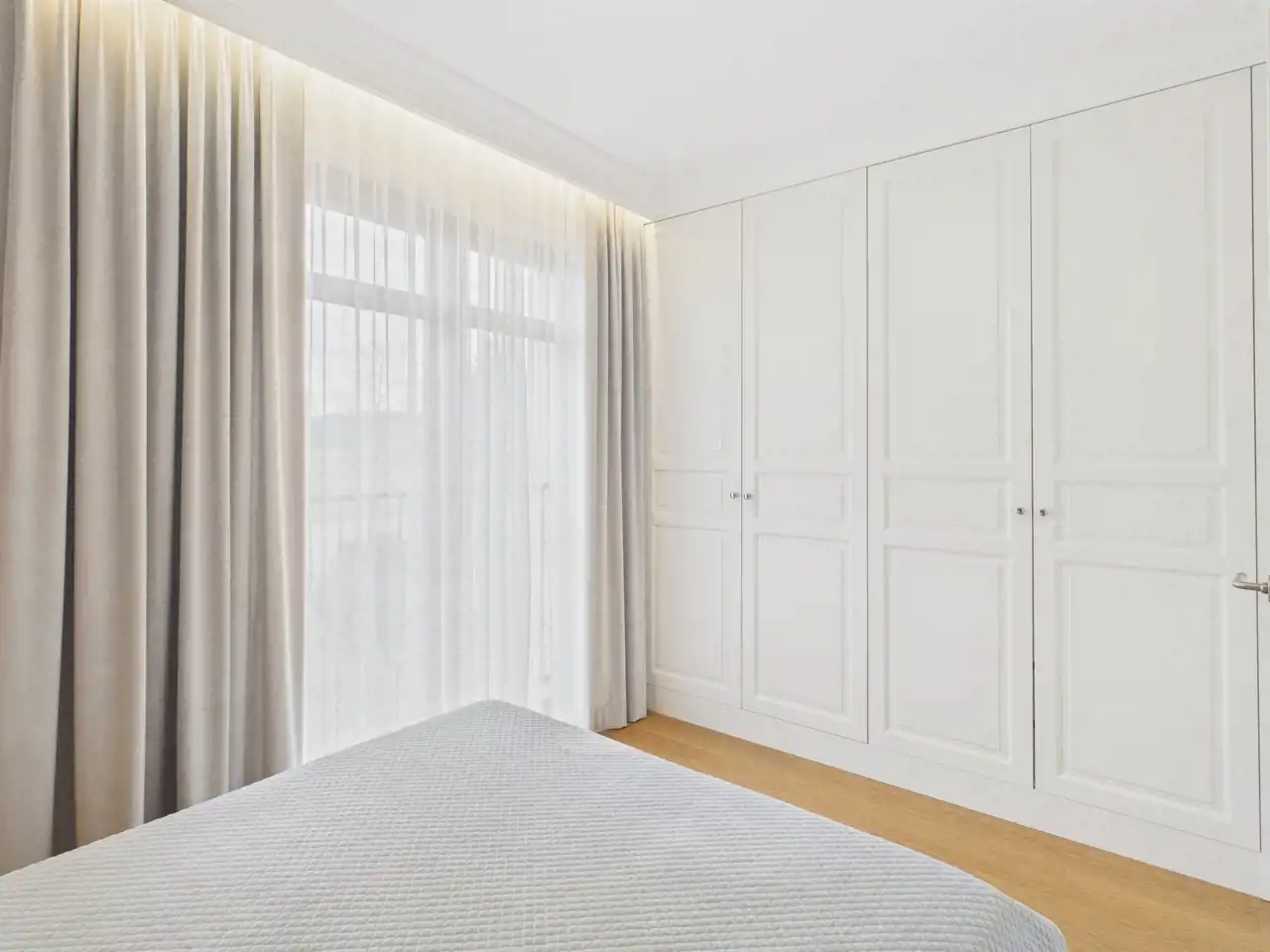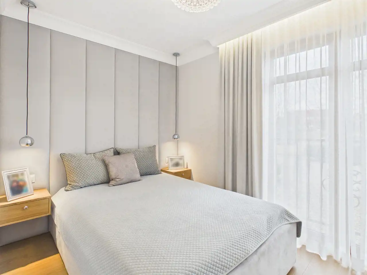 Sypialnia: Miękkie, tapicerowane wezgłowie oraz oświetlenie które tworzy przytulną atmosferę, a wysokie okno z lekkimi zasłonami pięknie doświetla wnętrze. W pomieszczeniu pojemna szafa na wymiar z eleganckim, wewnętrznym podświetleniem.