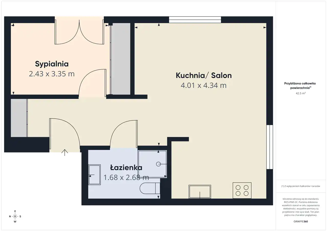 - Charakterystyka mieszkania 42.49 m2, 2 pokoje