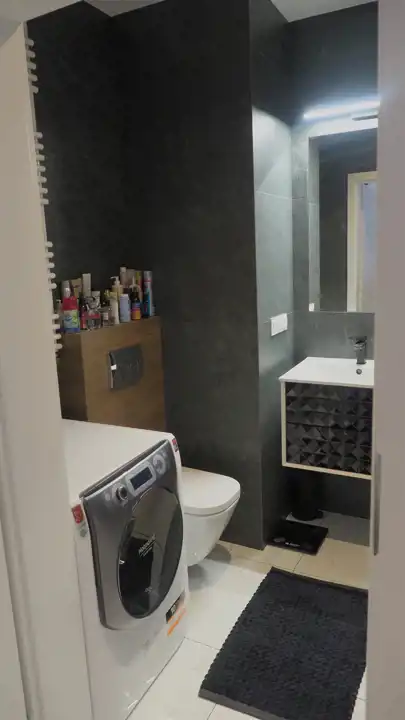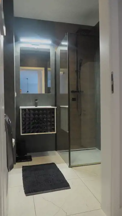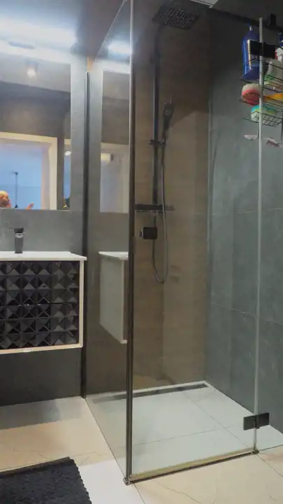 - Łazienka razem z WC- 4,04 m2 – w nowoczesnej glazurze, kabina prysznicowa z odpływem liniowym,