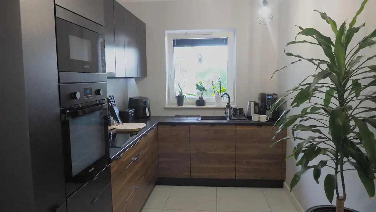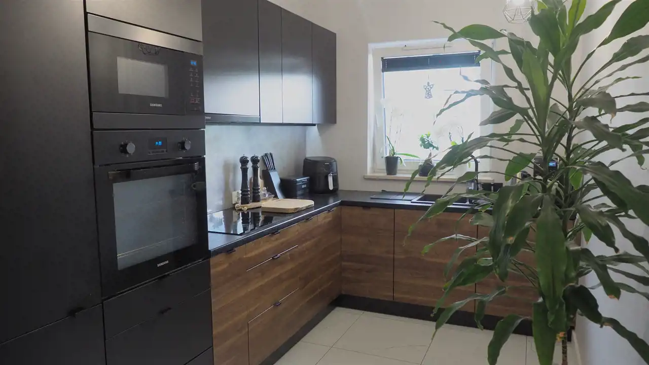 - Kuchnia - 8,93 m2 - z oknem , na podłodze kafle z nowoczesną zabudową i wyposażeniem w CENIE zabudowa meblowa kuchenna, lodówka, piekarnik i mikrofala w zabudowie, płyta indukcyjna, zmywarka.