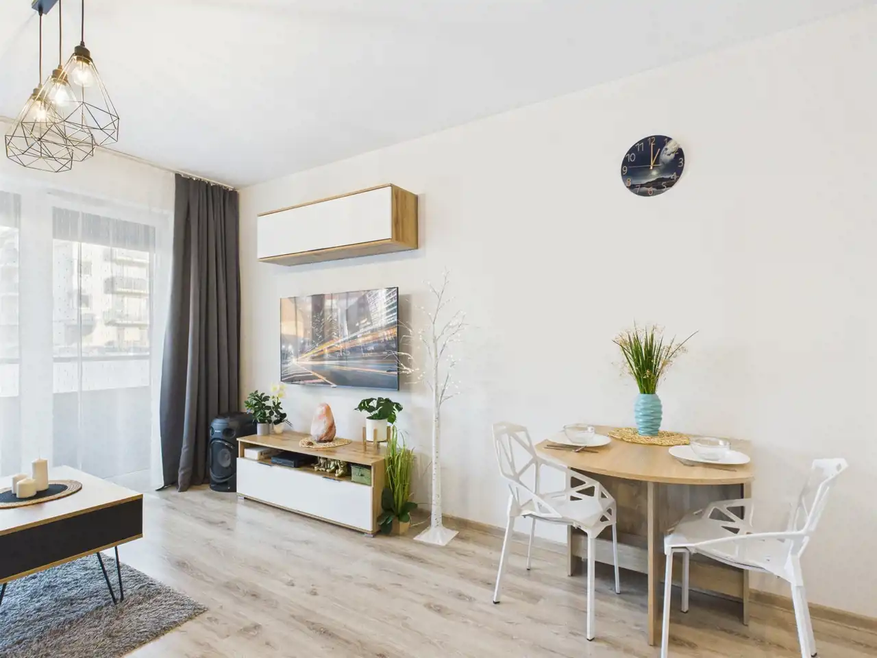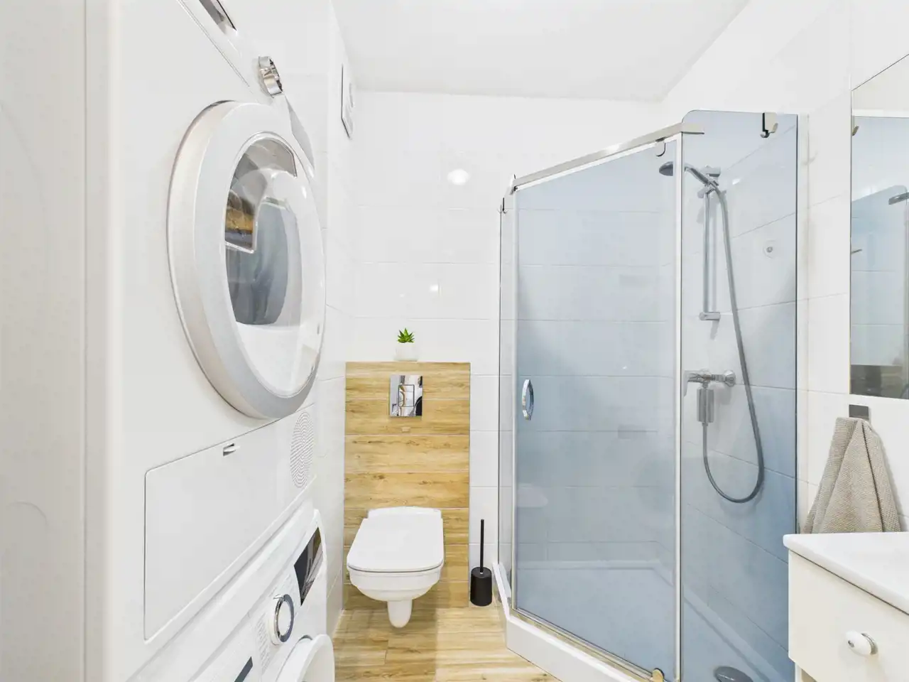 Całość urządzona w spójnym, nowoczesnym stylu i gotowa do zamieszkania bez dodatkowych nakładów finansowych. Łazienka została w pełni wyposażona i posiada prysznic, pralkę oraz suszarkę, co znacząco podnosi komfort użytkowania.