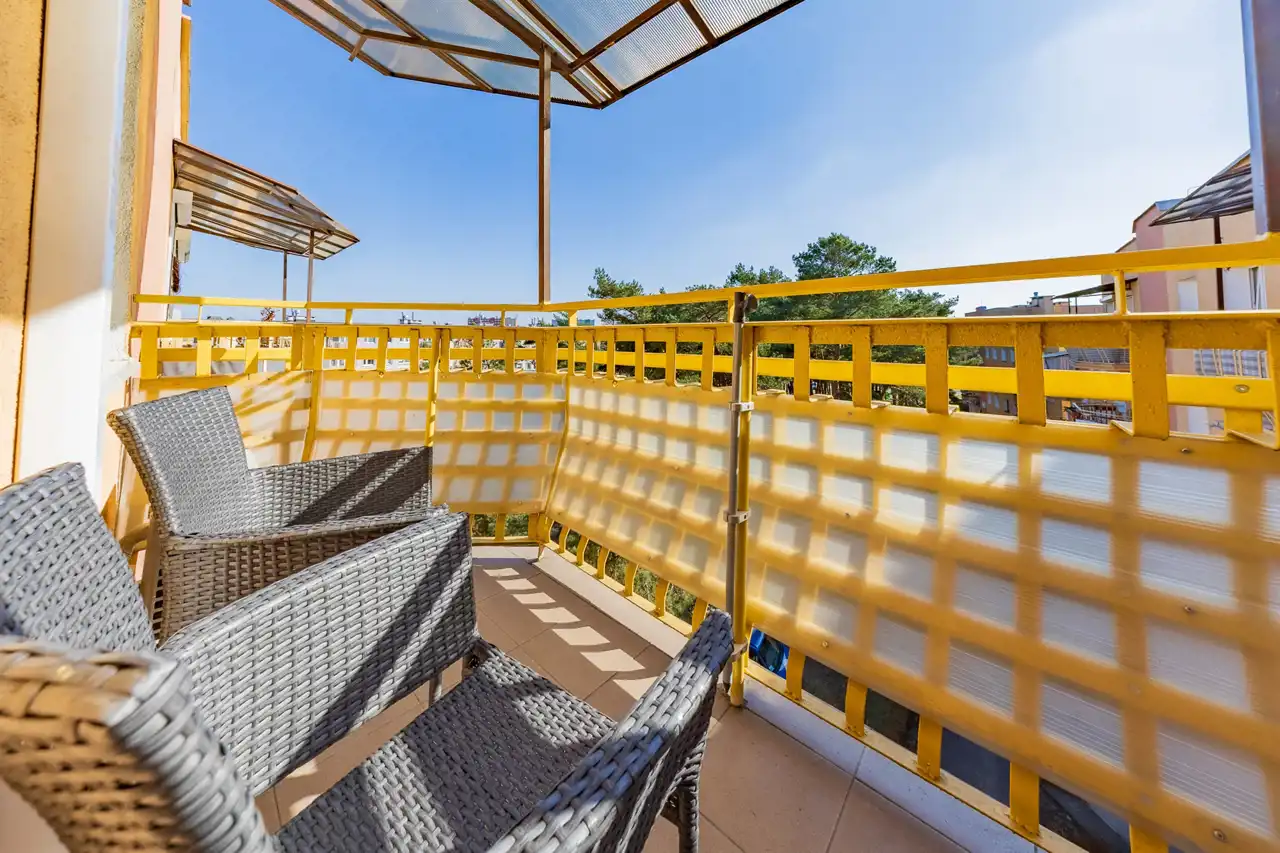 - Pełne wyposażenie okienne: Dla Twojej wygody każde okno posiada moskitierę, a intymność i cień zapewniają eleganckie plisy w części dziennej oraz rolety w sypialniach.