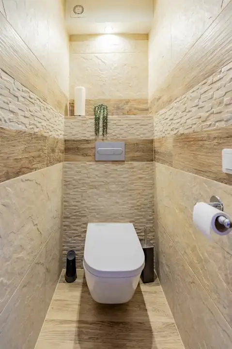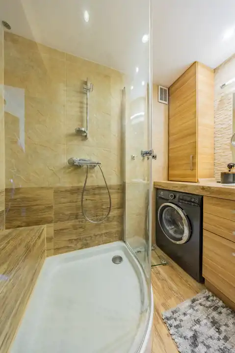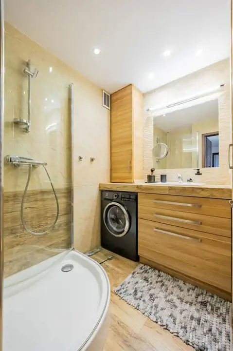 - Nowa łazienka i osobne WC: Funkcjonalna łazienka ze składaną kabiną Radaway (z wygodnym siedziskiem z płytek). Przemyślany układ zapewnia możliwość wysunięcia pralki.