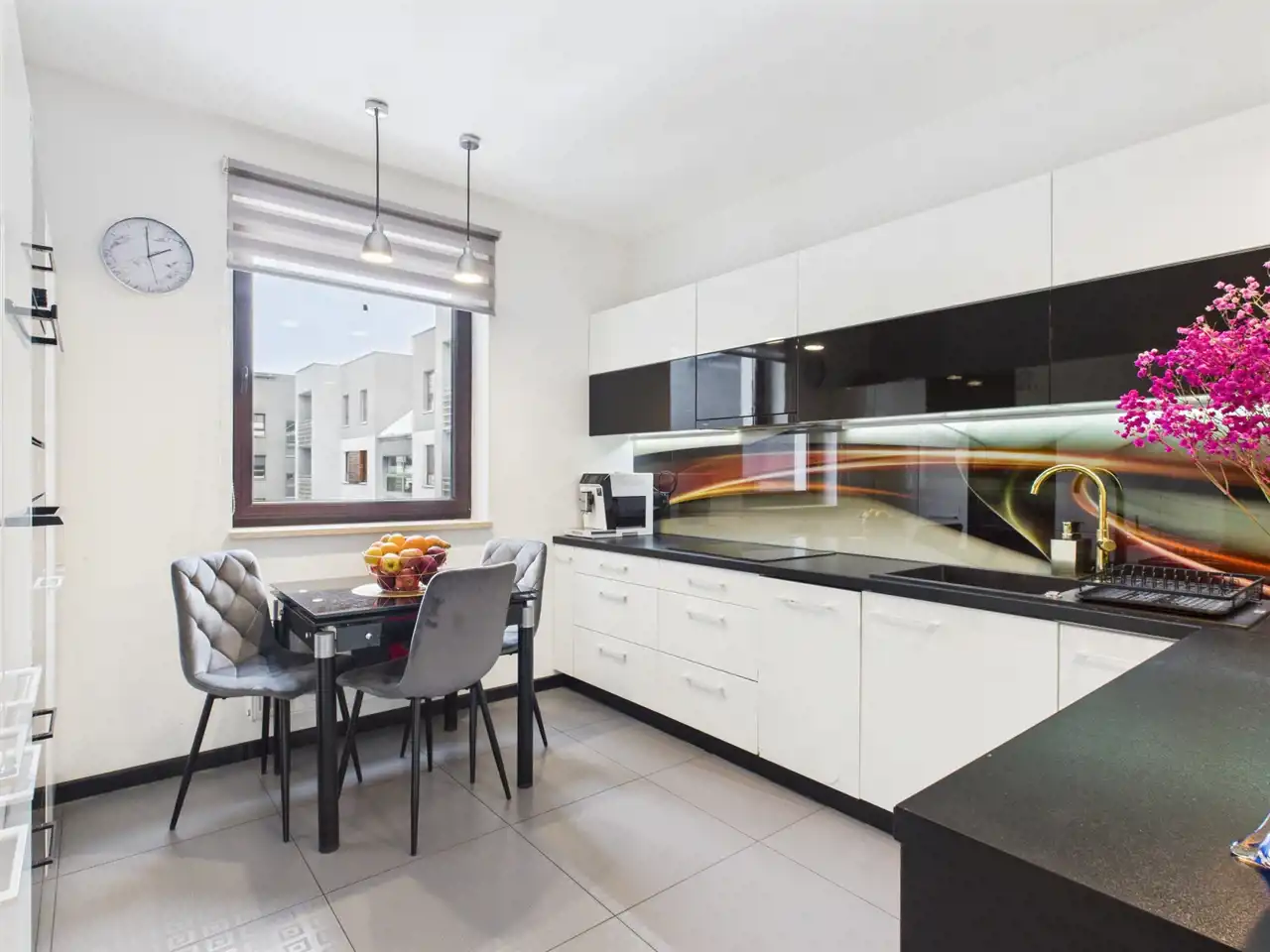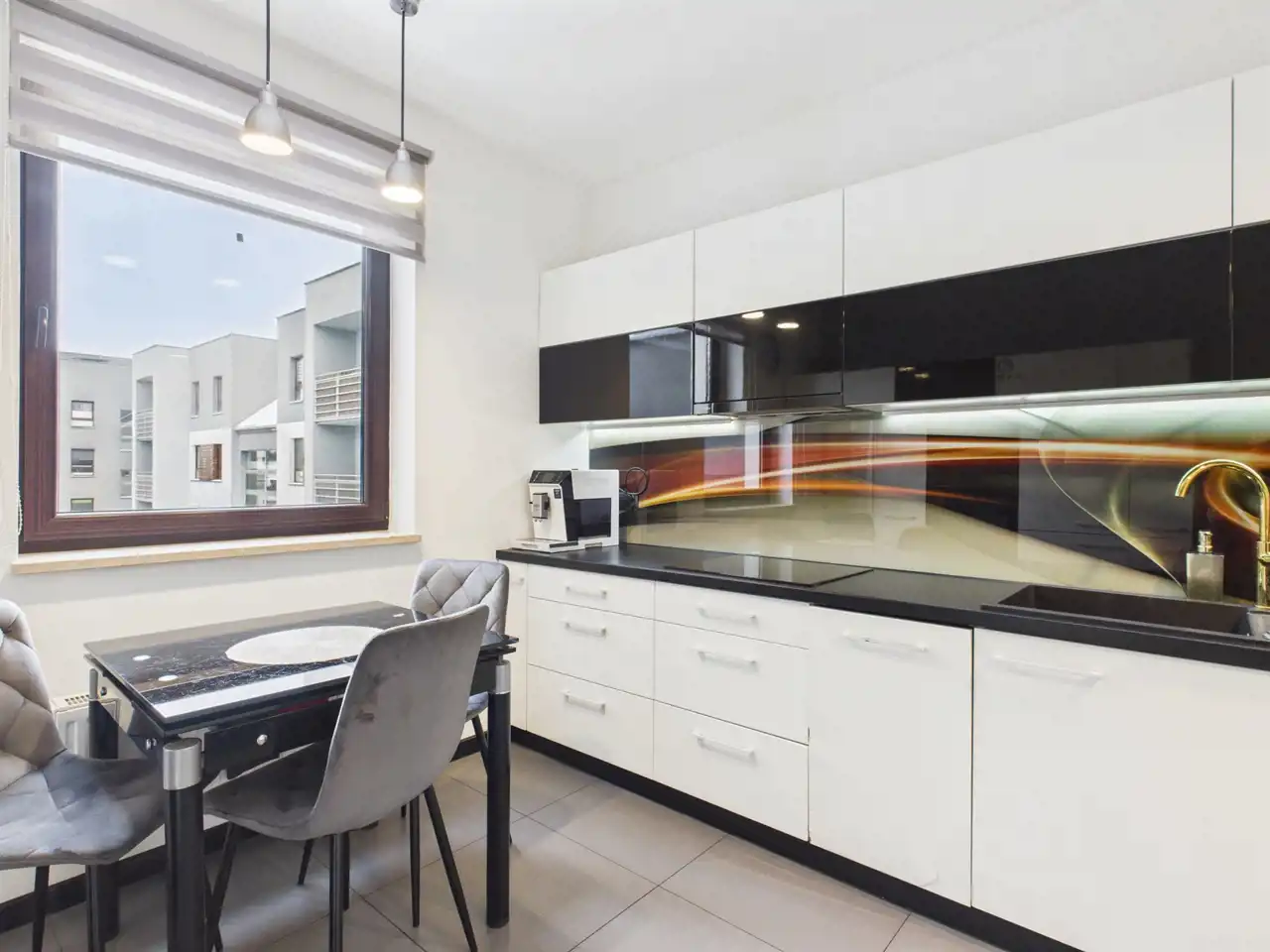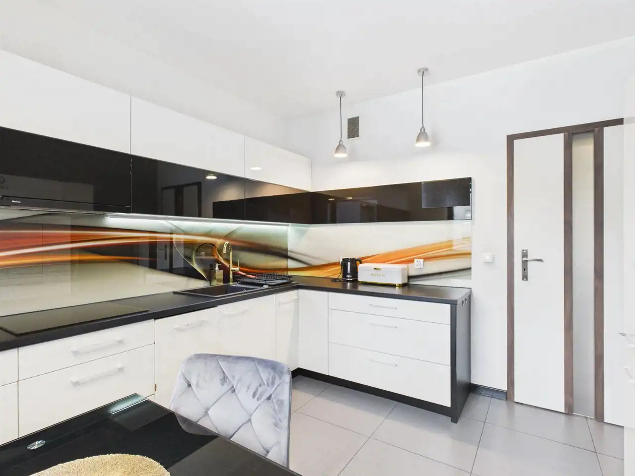 płyta indukcyjna, okap, piekarnik, mikrofala, zmywarka oraz lodówka. Stół i 3 krzesła tworzą wygodną przestrzeń do codziennych posiłków.