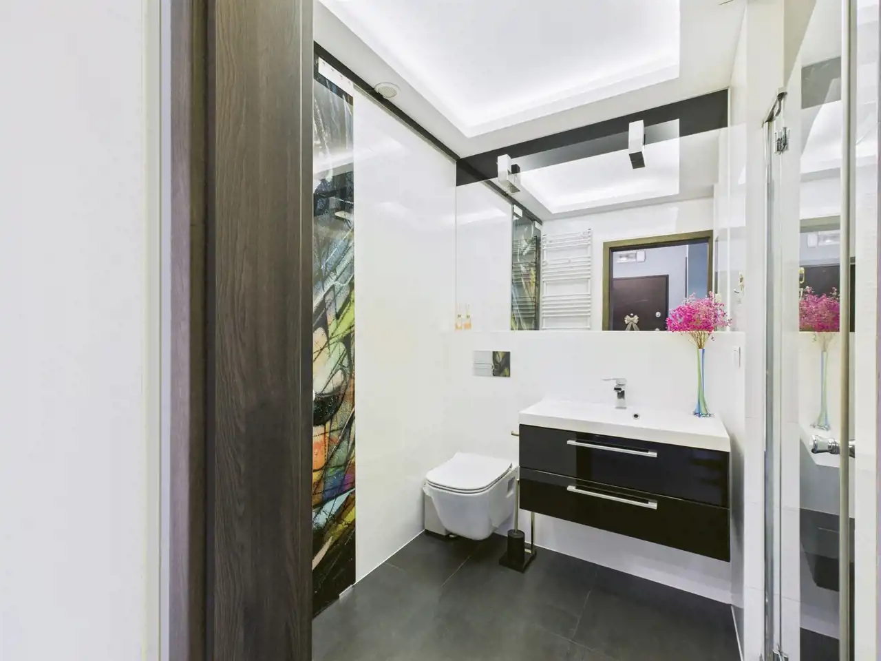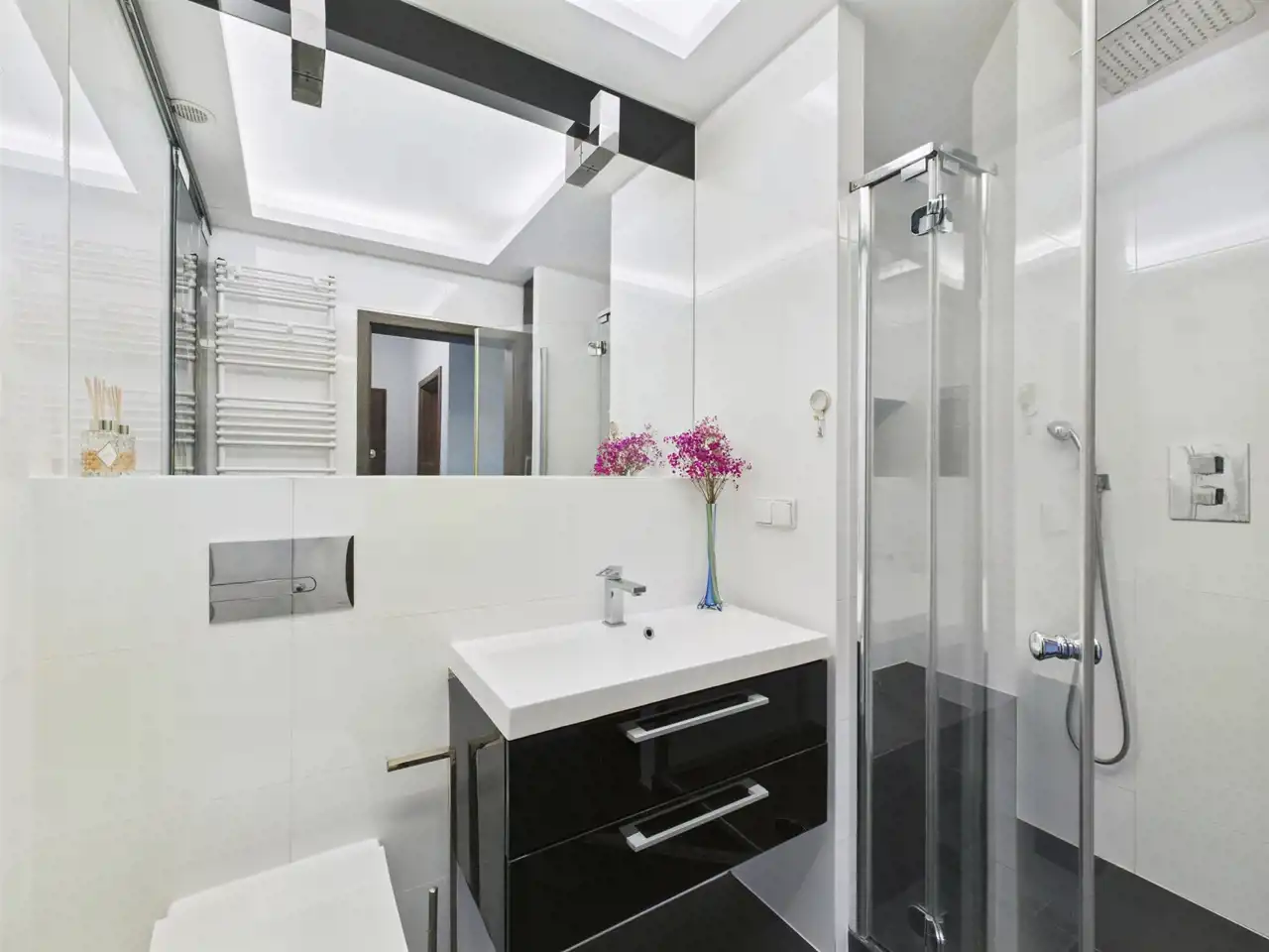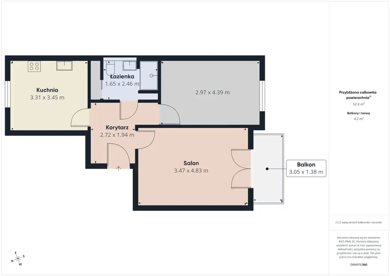- łazienka (4,3 m²) z elegancką zabudową i miejscem do przechowywania