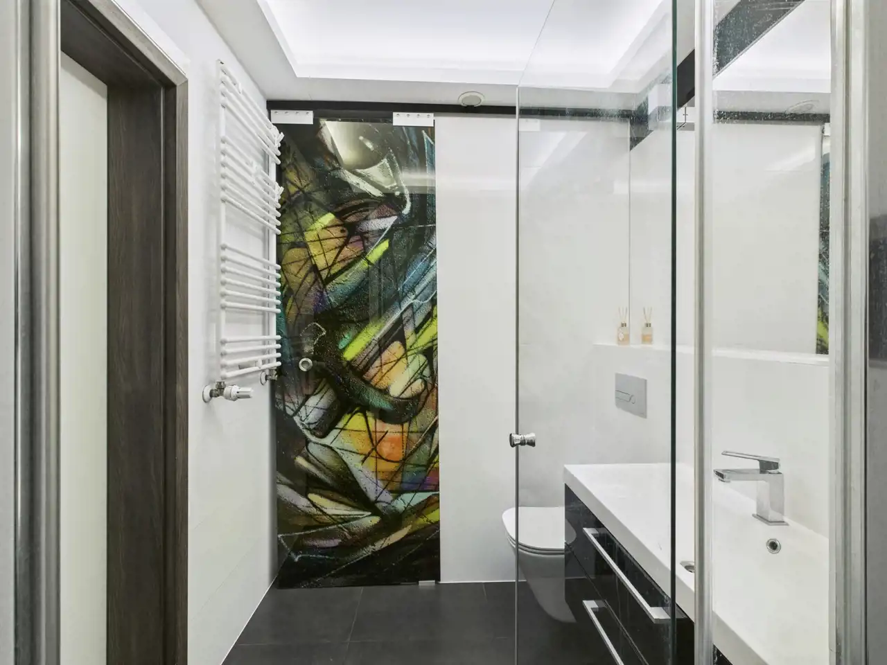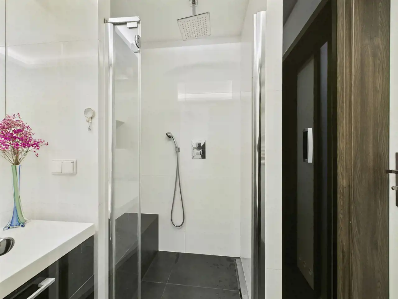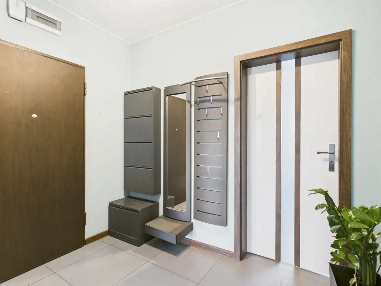 - łazienka (4,3 m²) z elegancką zabudową i miejscem do przechowywania