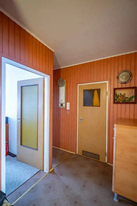 Na podłodze panele , wykładzina PCV, terakota. Glazura w łazience i w wc. Stolarka okienna PCV