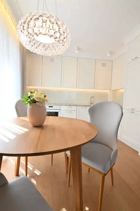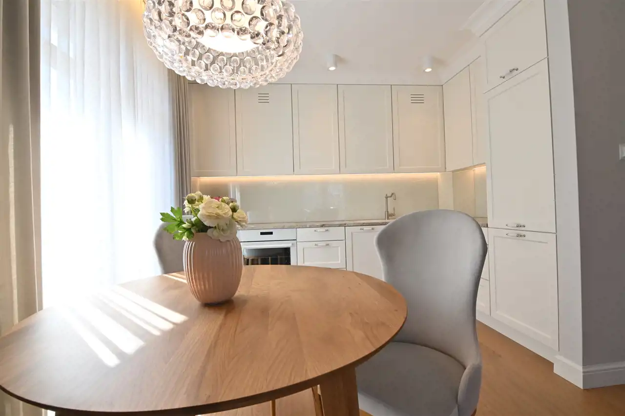 Centralnym punktem mieszkania jest jasny, harmonijnie zaprojektowany salon połączony z aneksem kuchennym:
