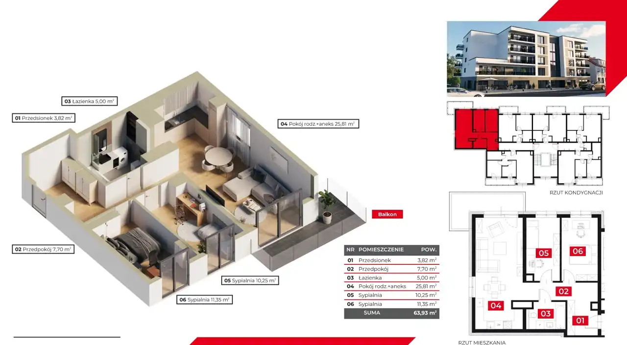 - Charakterystyka mieszkania 63.93 m2, 3 pokoje