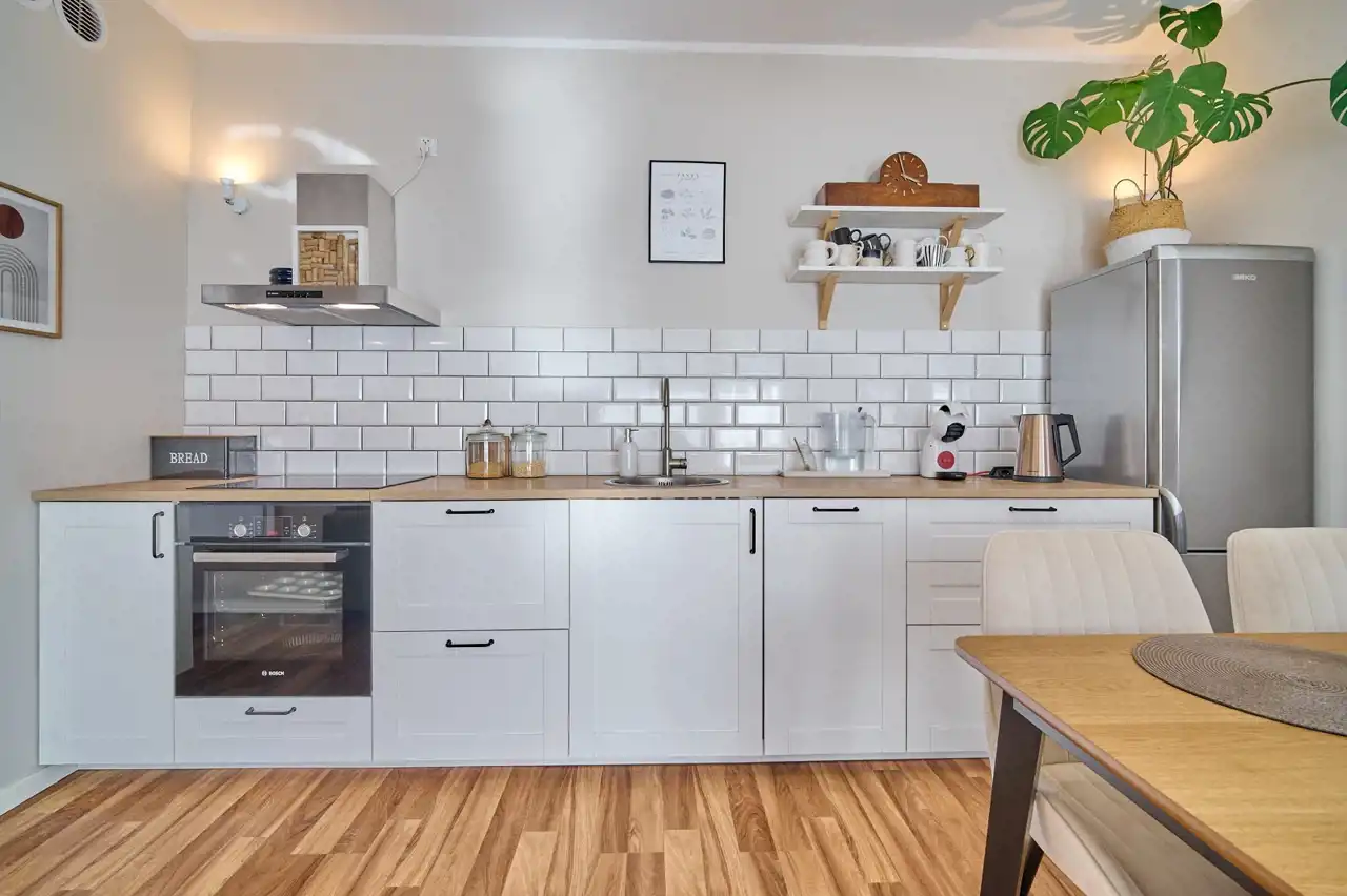 Przestronny, ponad 20-metrowy salon z aneksem kuchennym wyposażonym w meble wykonane na wymiar. W cenie pozostaje również sprzęt AGD: płyta indukcyjna, zmywarka, piekarnik, lodówko-zamrażarka oraz okap.