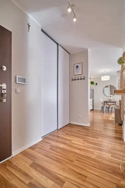 Przedpokój z pojemną szafą w zabudowie zapewnia dodatkowy komfort przechowywania.