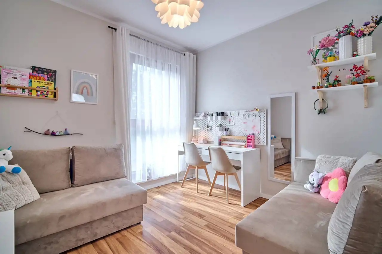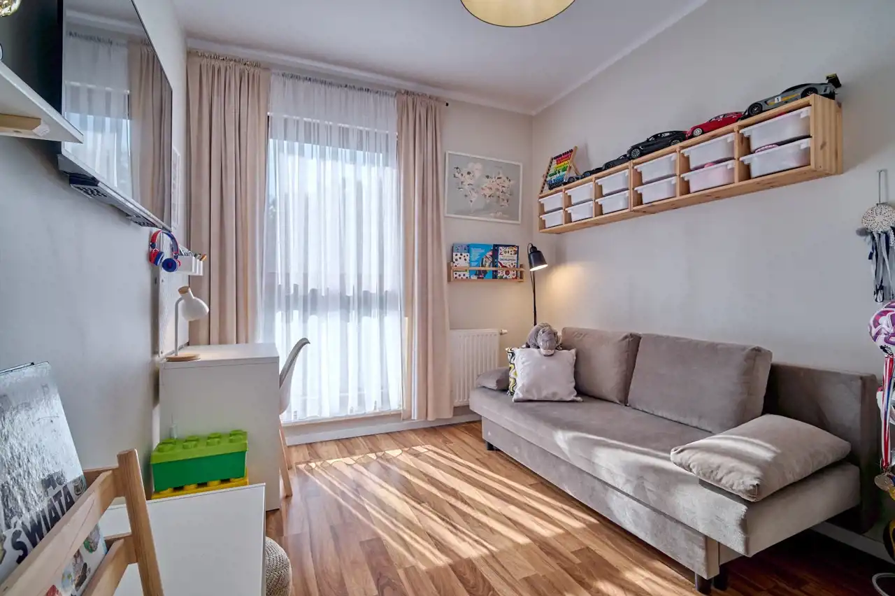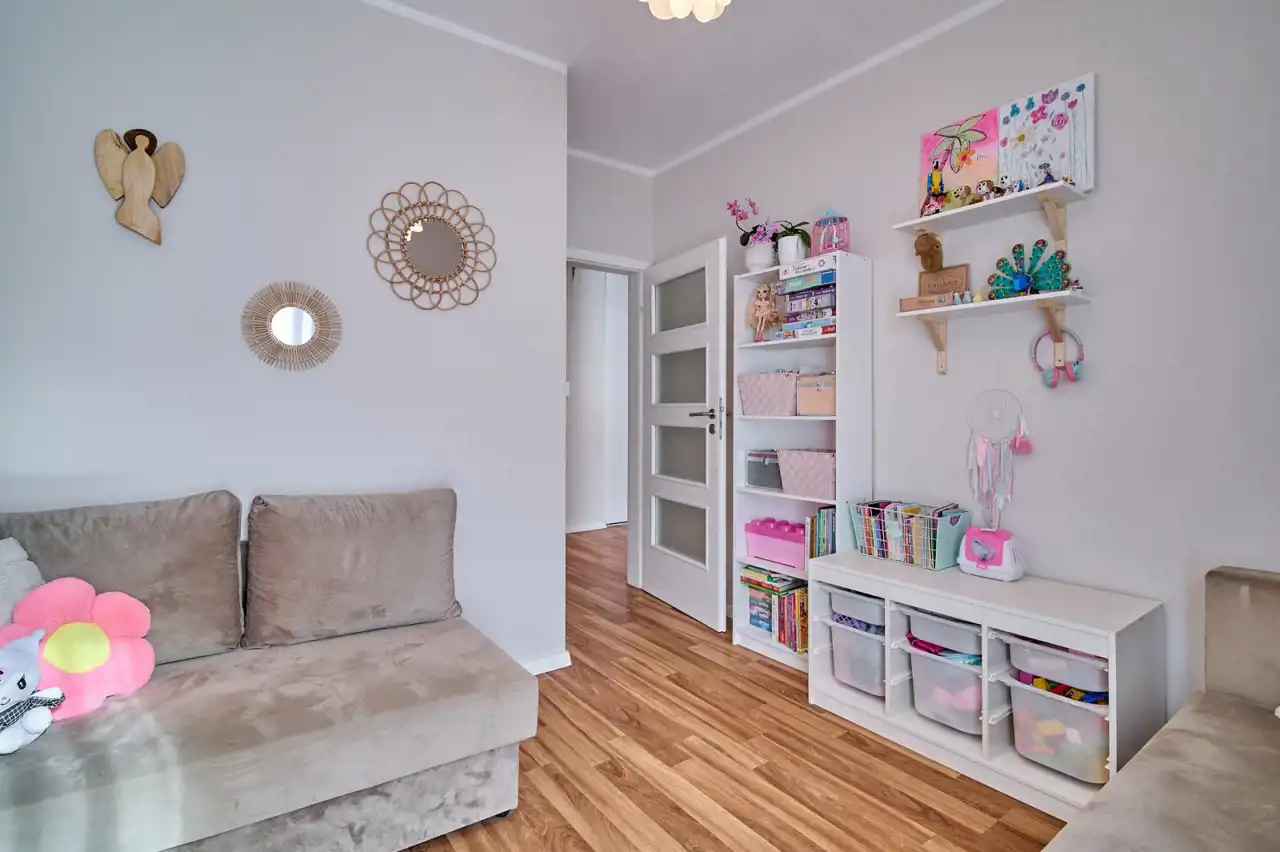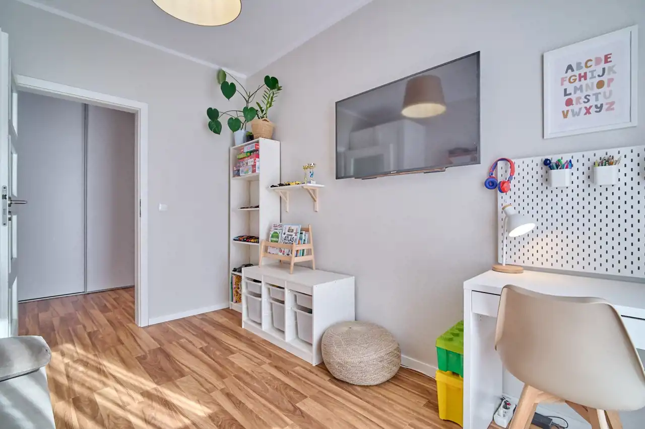 Dwa pokoje obecnie pełnią funkcję pokoi dziecięcych, jednak z łatwością można je przekształcić w sypialnię, gabinet czy przestrzeń do pracy zdalnej.